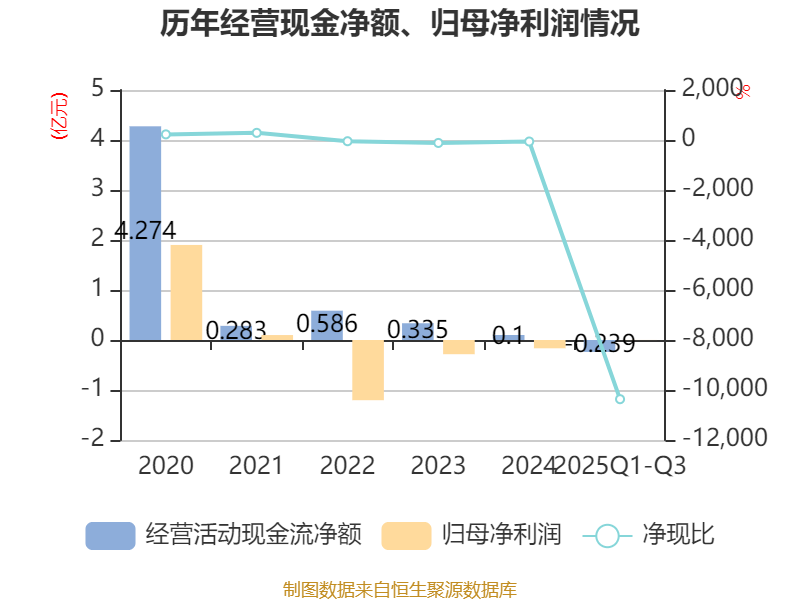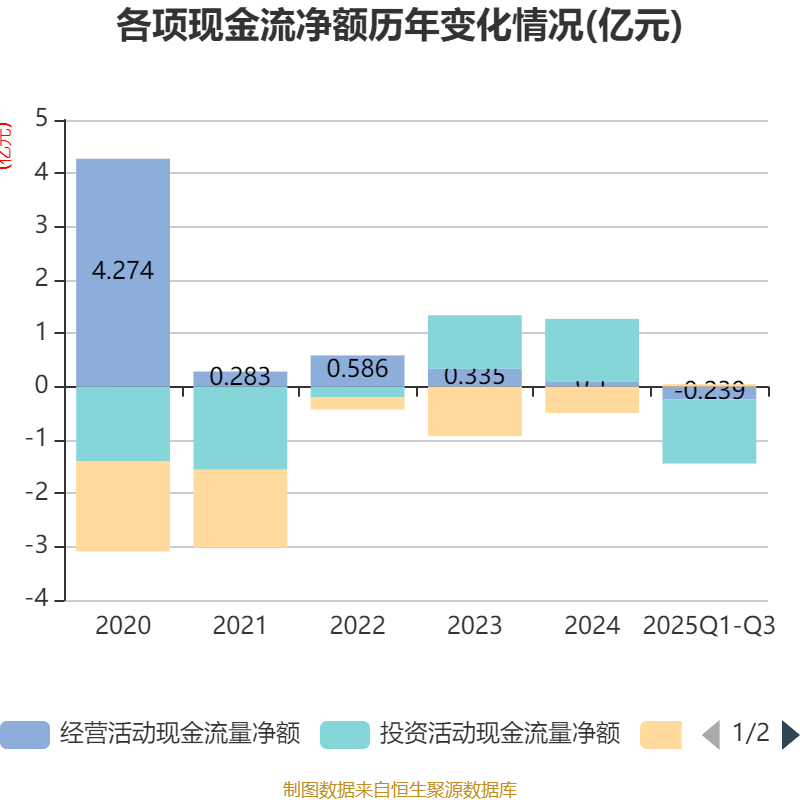 2025年前三季度,公司经营活动现金流净额为-2387.26万元,同比减少2668.15万元;筹资活动现金流净额459.92万元,同比增加4583.6万元;投资活动现金流净额-1.2亿元,上年同期为-4309.47万元。