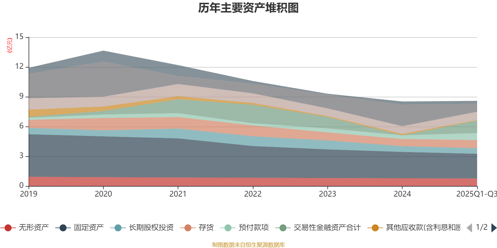 资产重大变化方面,截至2025年三季度末,公司货币资金较上年末减少62.3%,占公司总资产比重下降16.04个百分点;交易性金融资产合计占公司总资产的14.63%,上年末为0;预付款项较上年末增加83.33%,占公司总资产比重上升3.68个百分点;固定资产较上年末减少6.52%,占公司总资产比重下降2.26个百分点。