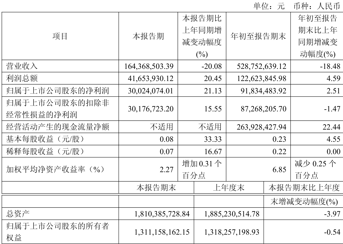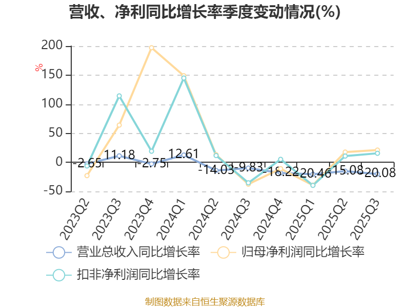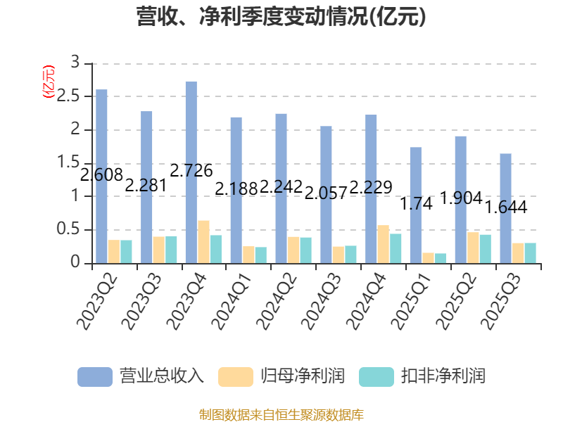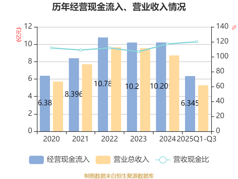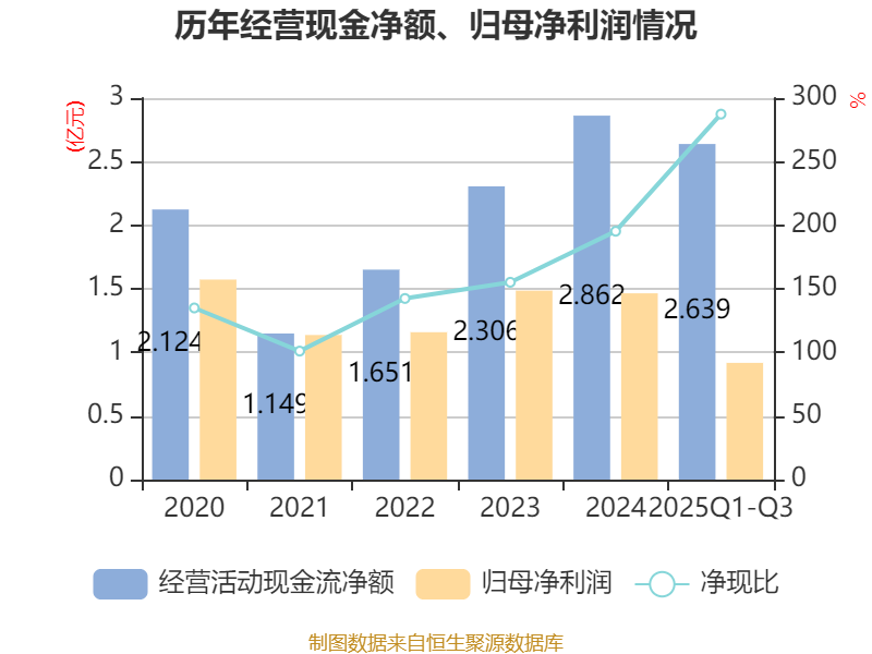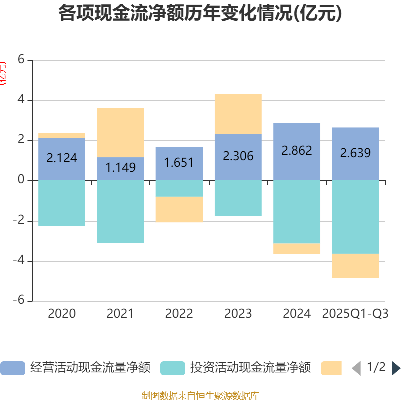 2025年前三季度,公司经营活动现金流净额为2.64亿元,同比增长22.44%;筹资活动现金流净额-1.22亿元,同比减少7017.85万元;投资活动现金流净额-3.65亿元,上年同期为-3.58亿元。