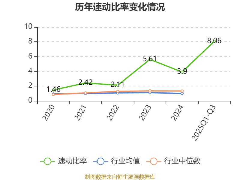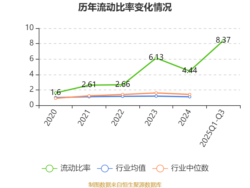 2025年前三季度,公司流动比率为8.37,速动比率为8.06。