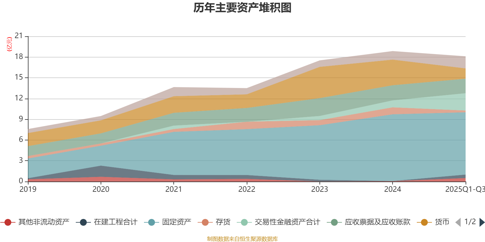 资产重大变化方面,截至2025年三季度末,公司货币资金较上年末减少60.01%,占公司总资产比重下降11.5个百分点;交易性金融资产合计较上年末增加149.69%,占公司总资产比重上升8.51个百分点;存货较上年末减少74.78%,占公司总资产比重下降3.94个百分点;在建工程合计较上年末增加4600.23%,占公司总资产比重上升2.74个百分点。