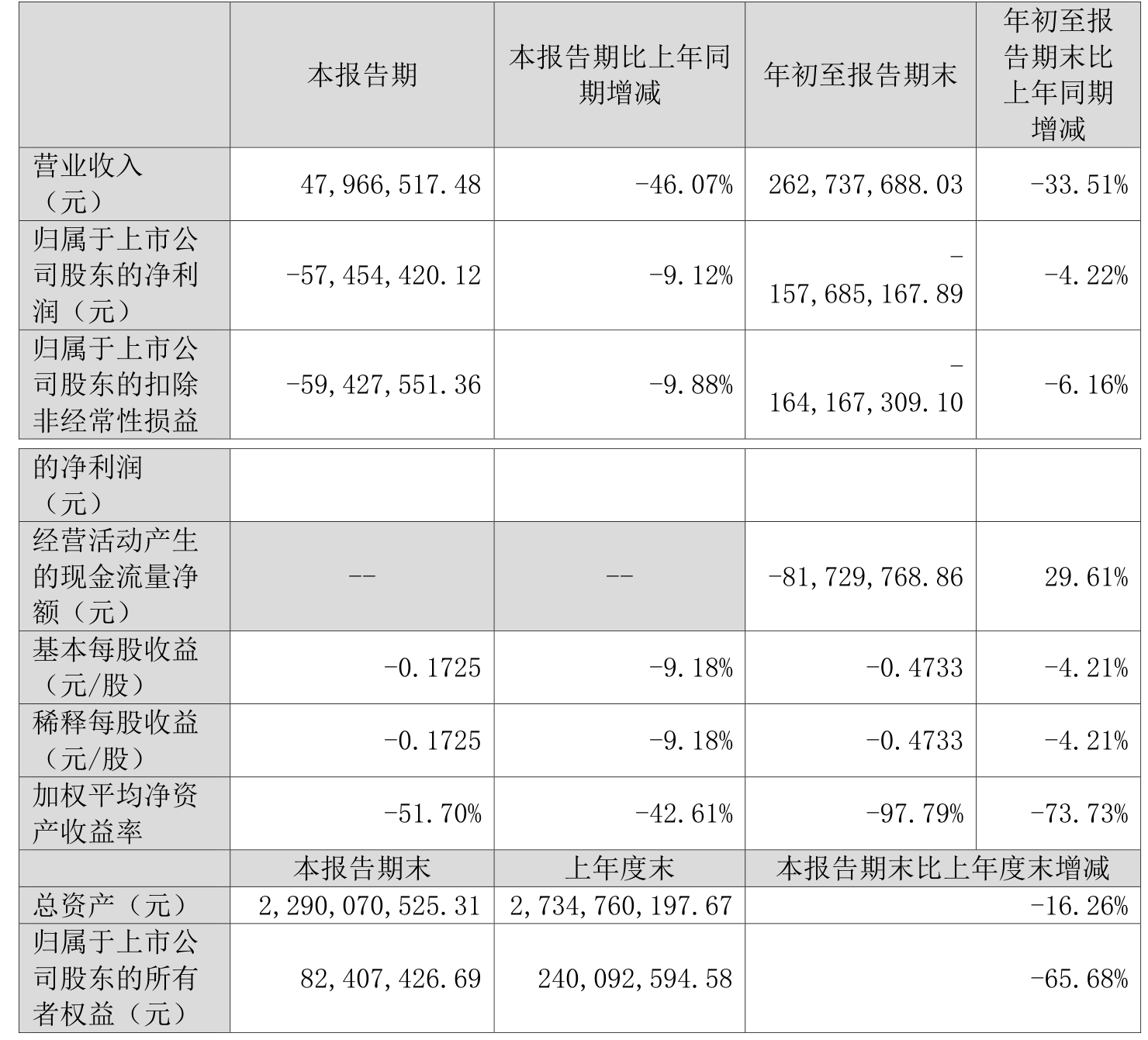 中证智能财讯雪浪环境(300385)10月28日披露2025年第三季度报告。前三季度公司实现营业总收入2.63亿元,同比下降33.51%;归母净利润亏损1.58亿元,上年同期亏损1.51亿元;扣非净利润亏损1.64亿元,上年同期亏损1.55亿元;经营活动产生的现金流量净额为-8172.98万元,上年同期为-1.16亿元;报告期内,雪浪环境基本每股收益为-0.4733元,加权平均净资产收益率为-97.79%。
