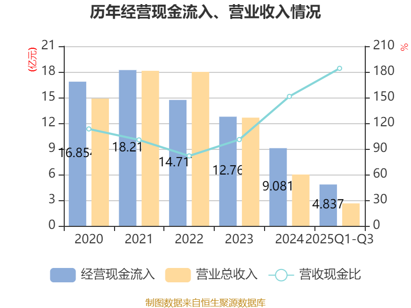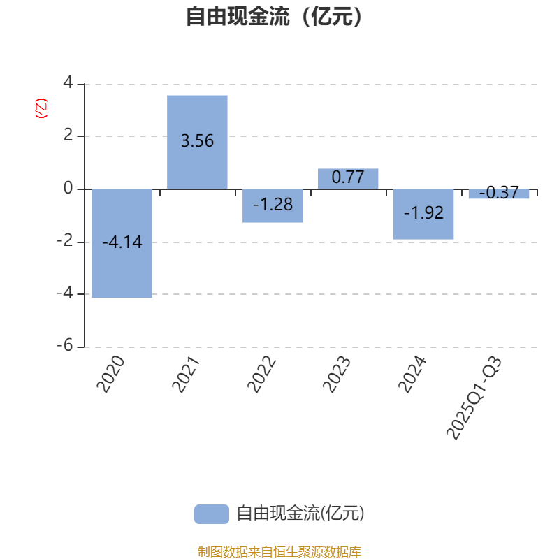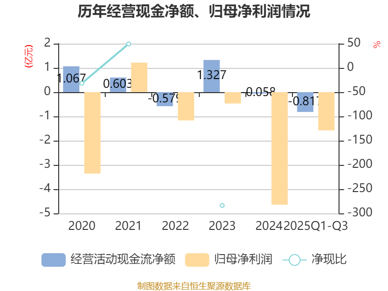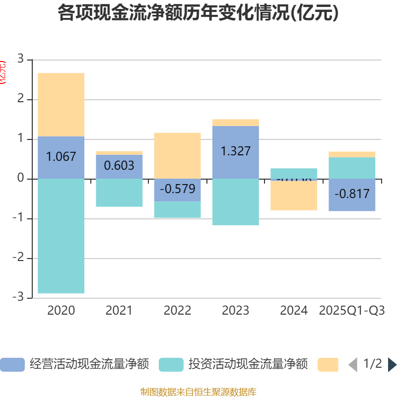 2025年前三季度,公司经营活动现金流净额为-8172.98万元,同比增加3438.37万元;筹资活动现金流净额1407.2万元,同比减少1439.68万元;投资活动现金流净额5395.59万元,上年同期为-5751.65万元。