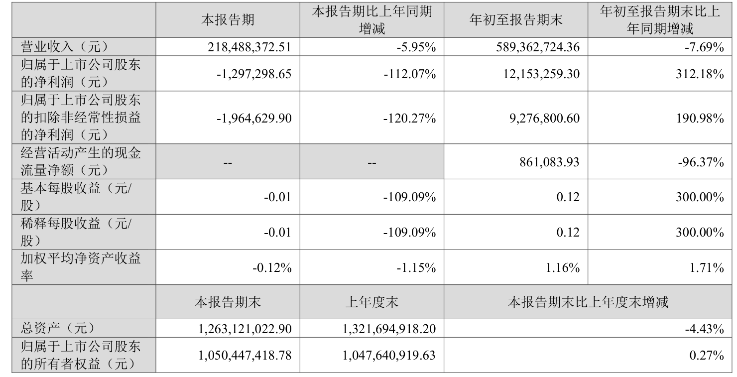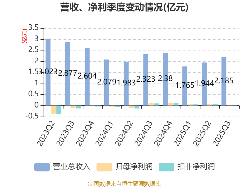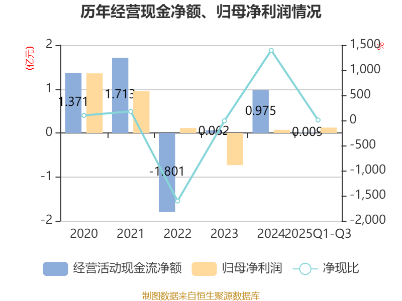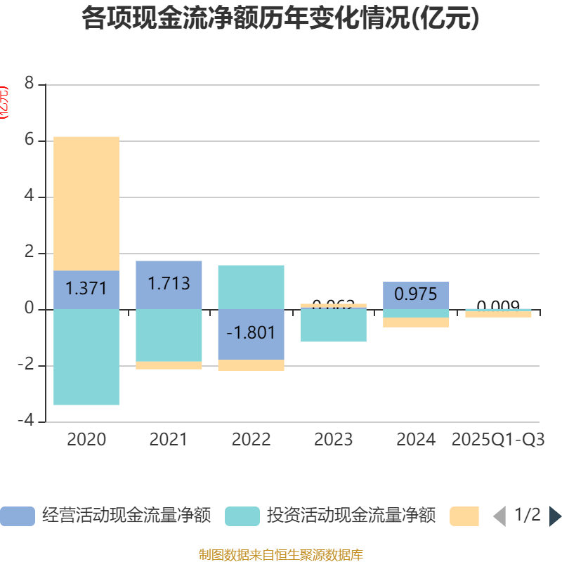 2025年前三季度,公司经营活动现金流净额为86.11万元,同比下降96.37%;筹资活动现金流净额-2166.71万元,同比增加887.06万元;投资活动现金流净额-792.56万元,上年同期为1602.81万元。