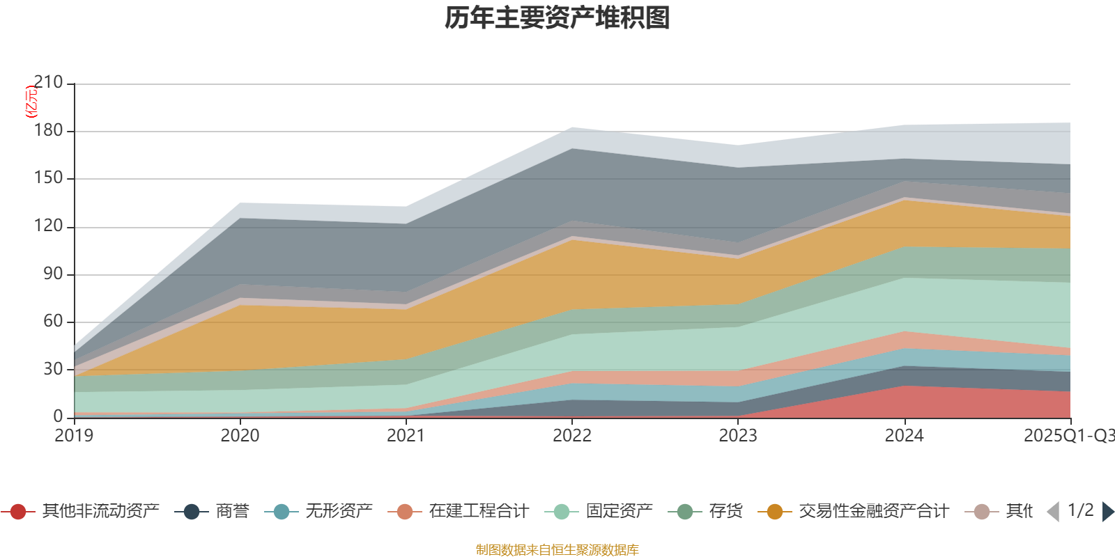 资产重大变化方面,截至2025年三季度末,公司交易性金融资产合计较上年末减少30.21%,占公司总资产比重下降4.89个百分点;固定资产较上年末增加22.39%,占公司总资产比重上升3.9个百分点;在建工程合计较上年末减少56.51%,占公司总资产比重下降3.32个百分点;一年内到期的非流动资产较上年末增加125.3%,占公司总资产比重上升2.32个百分点。