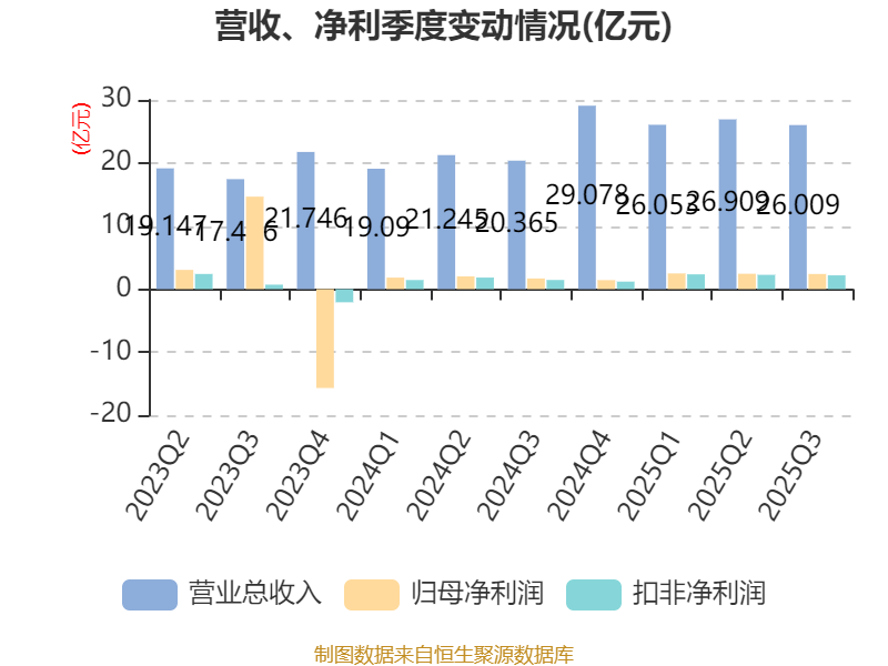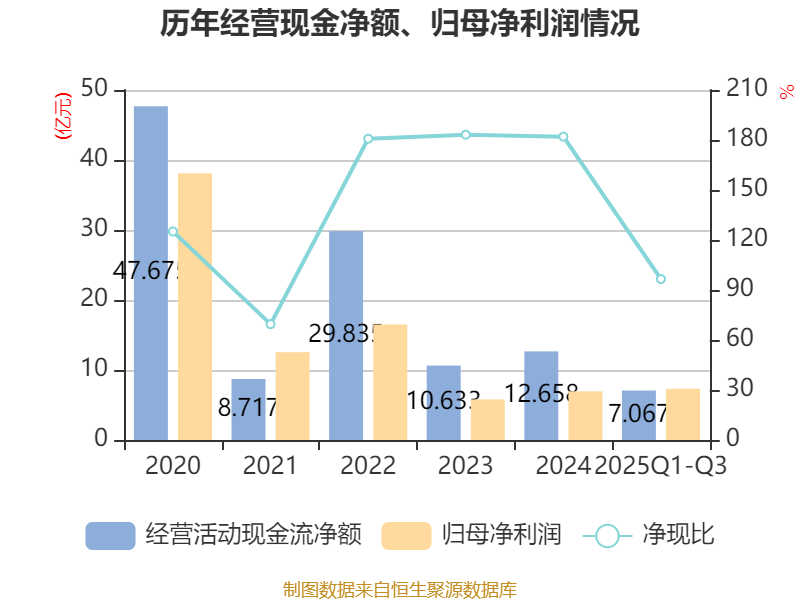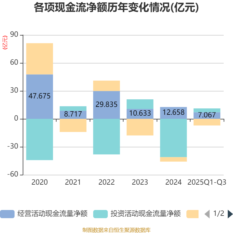 2025年前三季度,公司经营活动现金流净额为7.07亿元,同比增长44.92%;筹资活动现金流净额-7.13亿元,同比减少1.56亿元;投资活动现金流净额4.13亿元,上年同期为-7.51亿元。