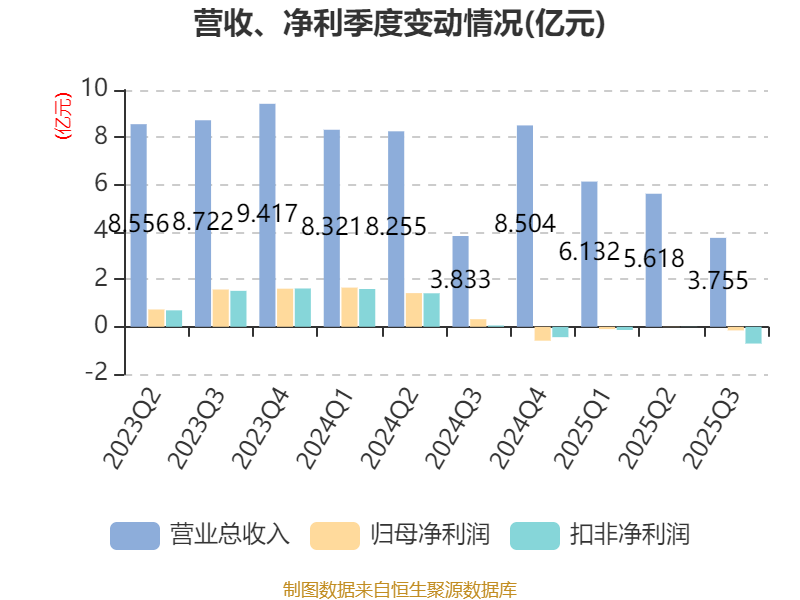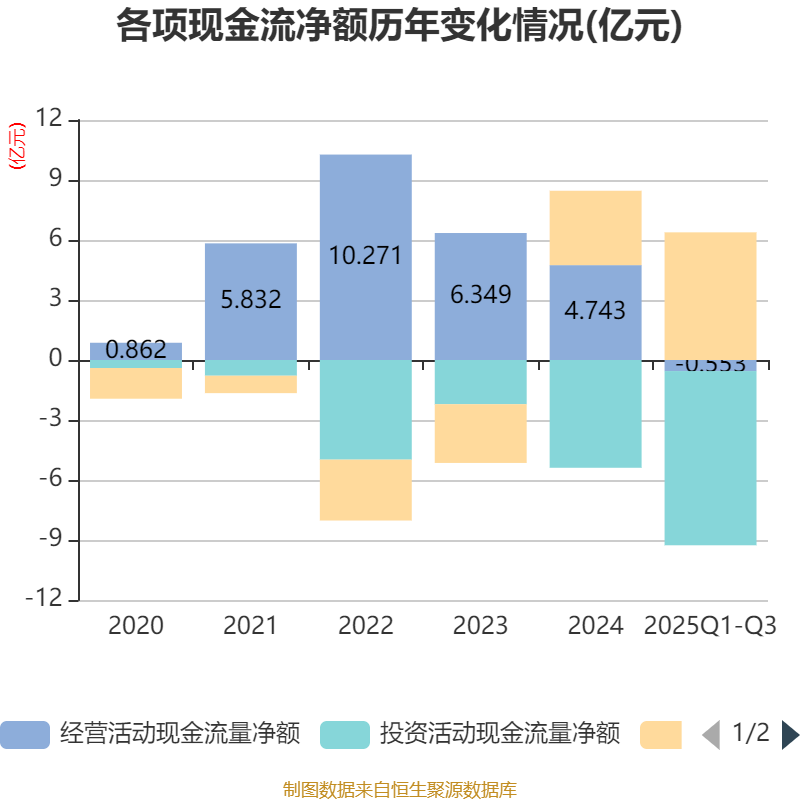 2025年前三季度,公司经营活动现金流净额为-5530.35万元,同比减少4.65亿元;筹资活动现金流净额6.38亿元,同比增加2.77亿元;投资活动现金流净额-8.71亿元,上年同期为-4.65亿元。