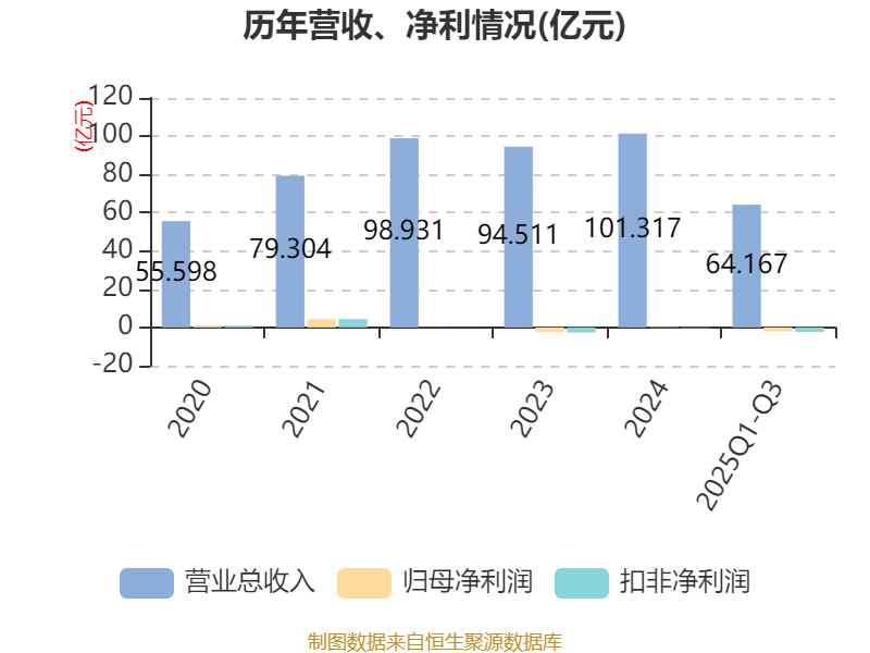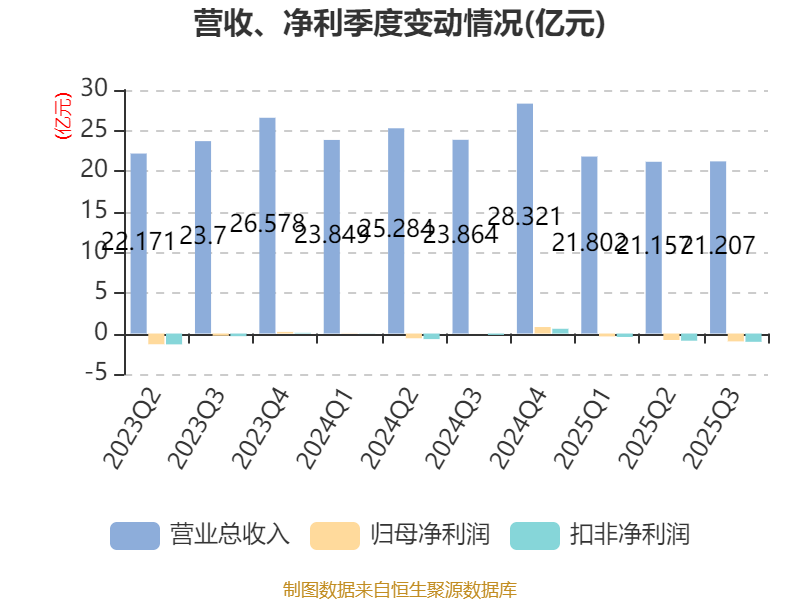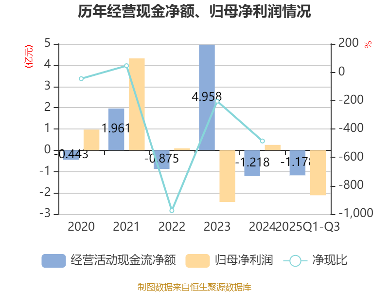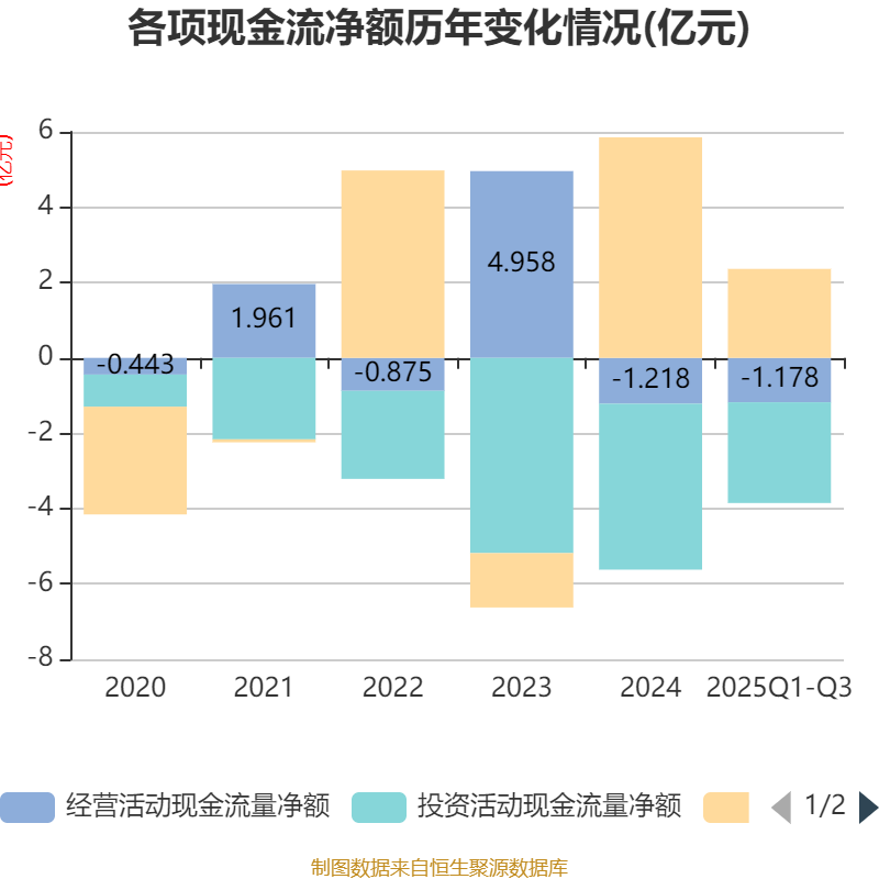 2025年前三季度,公司经营活动现金流净额为-1.18亿元,同比增加1.24亿元;筹资活动现金流净额2.36亿元,同比减少2.07亿元;投资活动现金流净额-2.68亿元,上年同期为-3.65亿元。