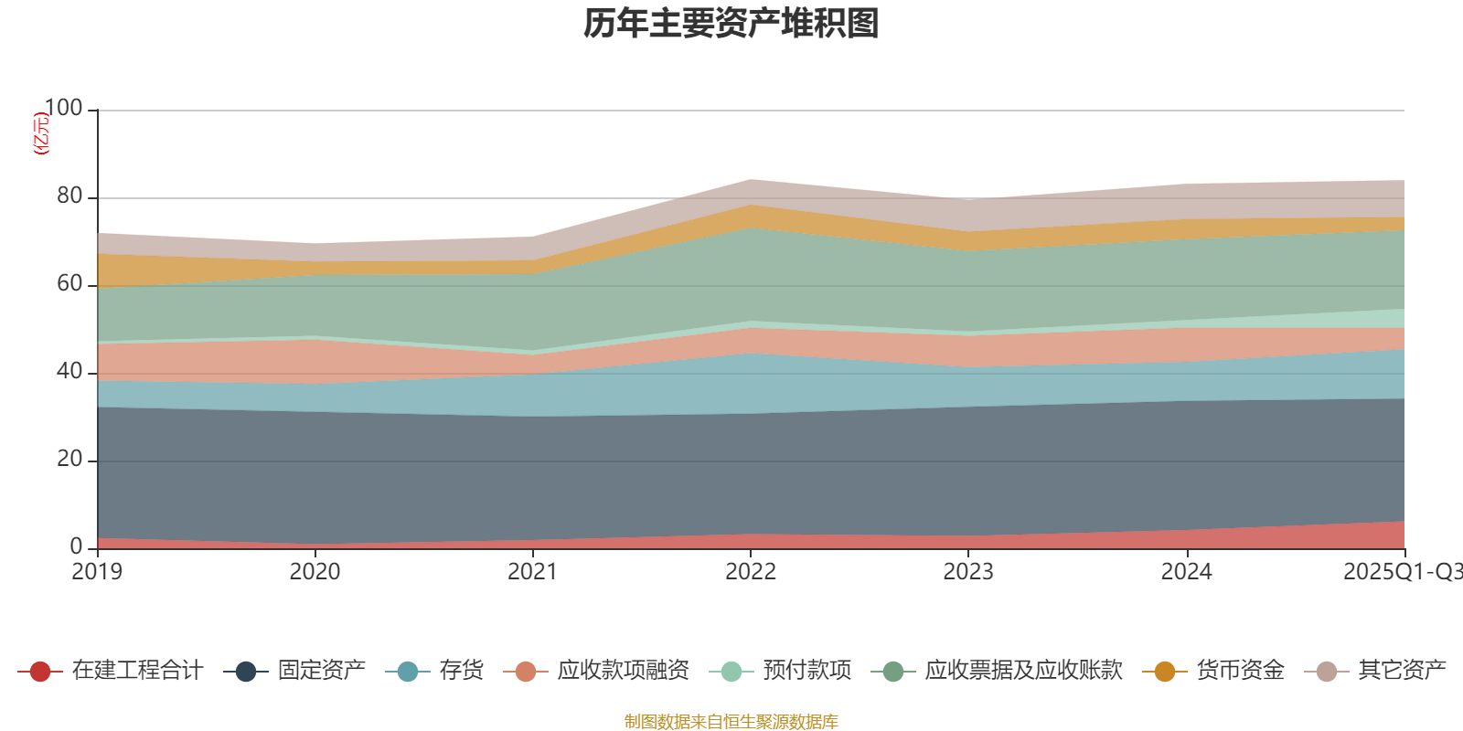 资产重大变化方面,截至2025年三季度末,公司应收款项融资较上年末减少36.69%,占公司总资产比重下降3.51个百分点;预付款项较上年末增加148.07%,占公司总资产比重上升3.01个百分点;存货较上年末增加26.11%,占公司总资产比重上升2.68个百分点;在建工程合计较上年末增加47.04%,占公司总资产比重上升2.29个百分点。
