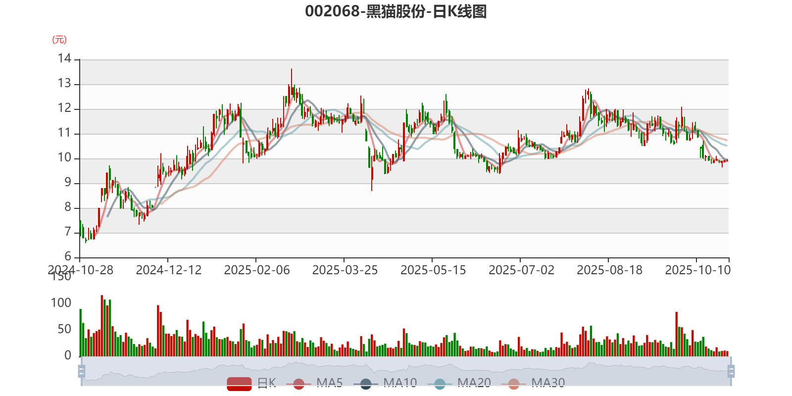 中证智能财讯黑猫股份(002068)10月28日披露2025年第三季度报告。前三季度公司实现营业总收入64.17亿元,同比下降12.10%;归母净利润亏损2.12亿元,上年同期亏损5500万元;扣非净利润亏损2.33亿元,上年同期亏损8777.29万元;经营活动产生的现金流量净额为-1.18亿元,上年同期为-2.42亿元;报告期内,黑猫股份基本每股收益为-0.2876元,加权平均净资产收益率为-7.37%。