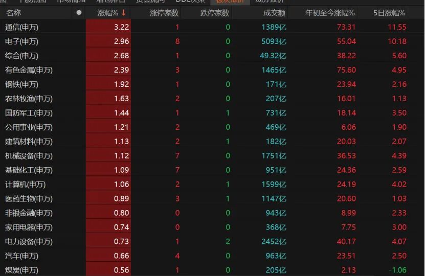 31个申万一级行业中多数板块收涨,通信、电子、有色金属、国防军工等热门赛道涨幅靠前。