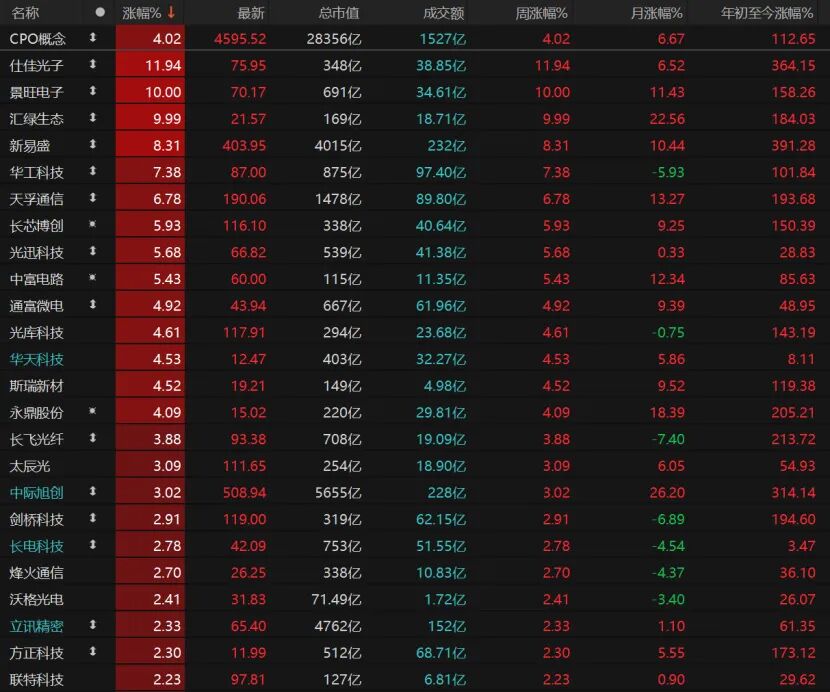 CPO(共封装光学)概念股延续强势,“易中天”继续走强。中际旭创涨逾3%报508.94元/股,新易盛涨逾8%报403.95元/股,天孚通信涨近7%报190.06元/股。