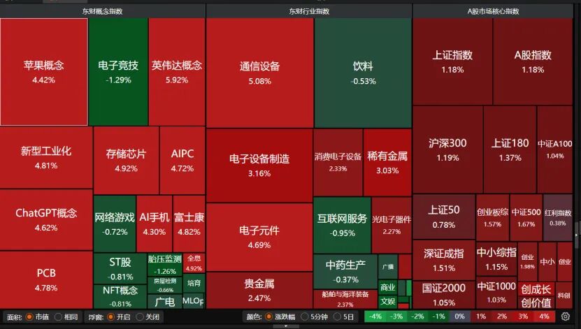 市场热点轮番活跃,科技股表现强于传统股,通信设备、PCB(印制电路板)、英伟达概念、电子元件、稀有金属等热门赛道大涨。