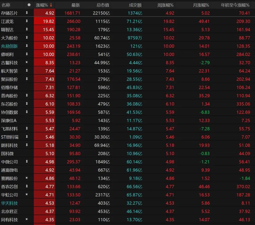 存储芯片概念股全天走强,华虹公司、中微公司涨近5%,大为股份、兆易创新、德明利涨停。
