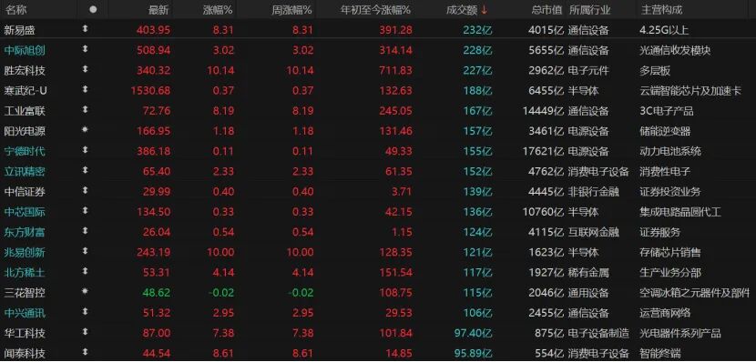 今日共计3361只个股收涨,涨停股63只;1862只个股收跌,跌停股15只。今日成交额超过100亿元的个股共计15只,主要集中在科技股,且多数大涨。其中,新易盛、中际旭创、胜宏科技日成交额均超过200亿元,股价涨势强劲。