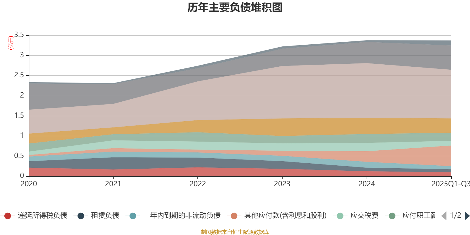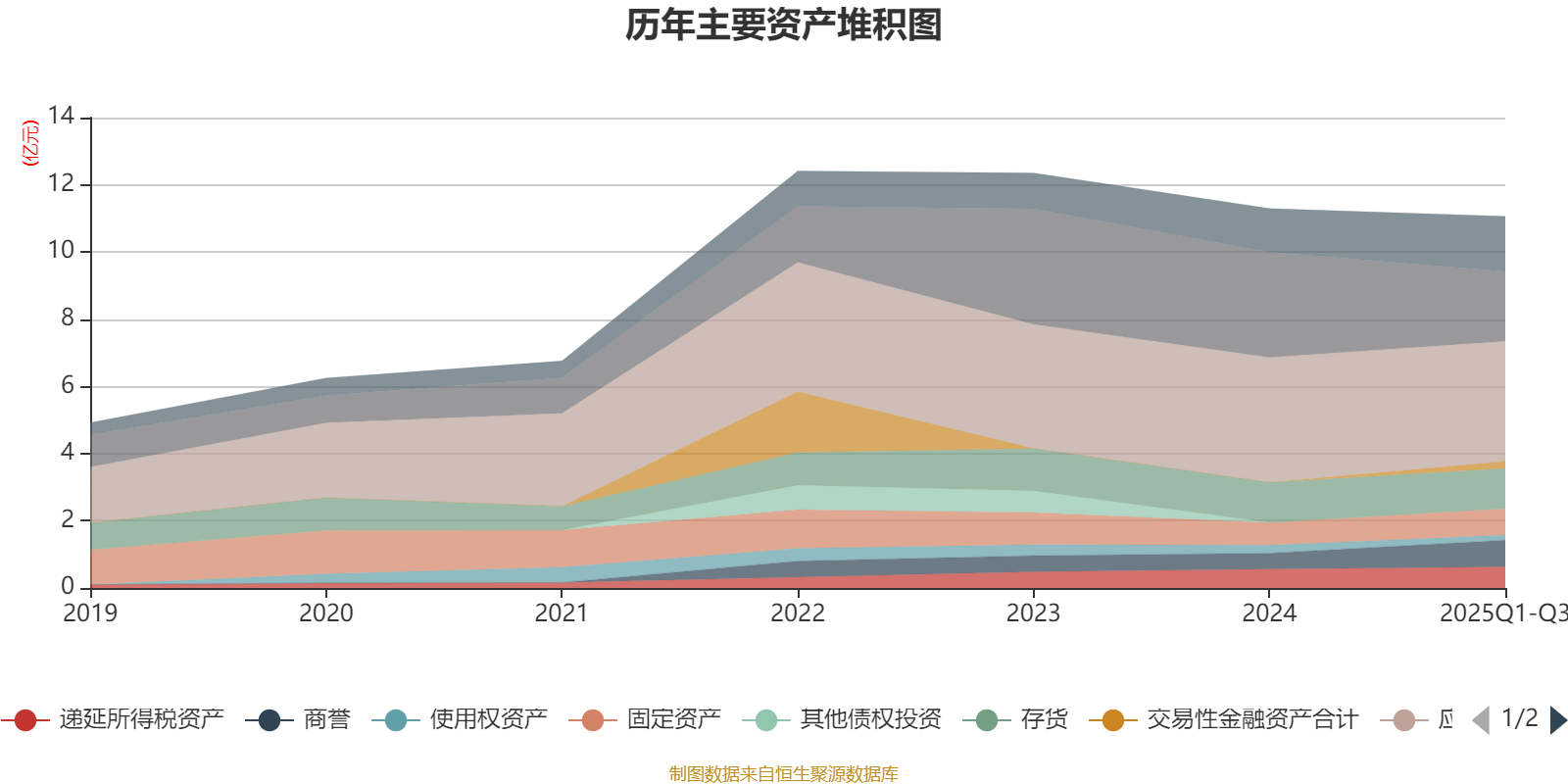 资产重大变化方面,截至2025年三季度末,公司货币资金较上年末减少33.74%,占公司总资产比重下降8.98个百分点;其他非流动资产较上年末增加2032.27%,占公司总资产比重上升3.72个百分点;商誉较上年末增加65.56%,占公司总资产比重上升2.94个百分点;一年内到期的非流动资产较上年末减少100%,占公司总资产比重下降2.92个百分点。
