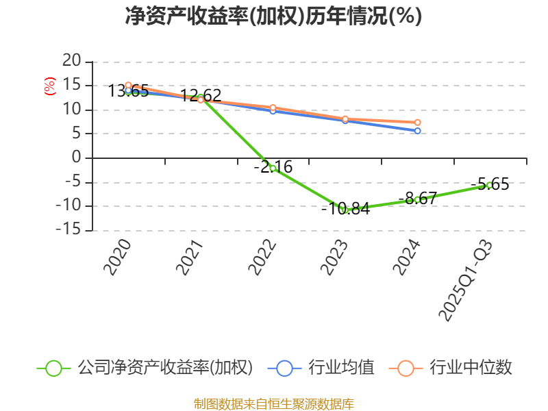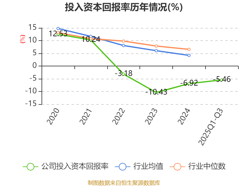 盈利能力方面, 2025年前三季度公司加权平均净资产收益率为-5.65%,同比下降0.94个百分点。公司2025年前三季度投入资本回报率为-5.46%,较上年同期下降0.64个百分点。