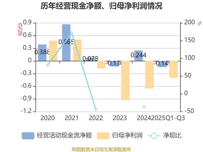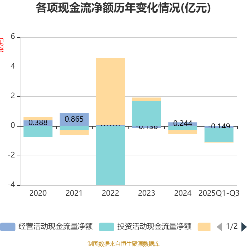 2025年前三季度,公司经营活动现金流净额为-1494.13万元,同比增加404.48万元;筹资活动现金流净额-319.18万元,同比增加6756.83万元;投资活动现金流净额-9365.44万元,上年同期为-988.17万元。