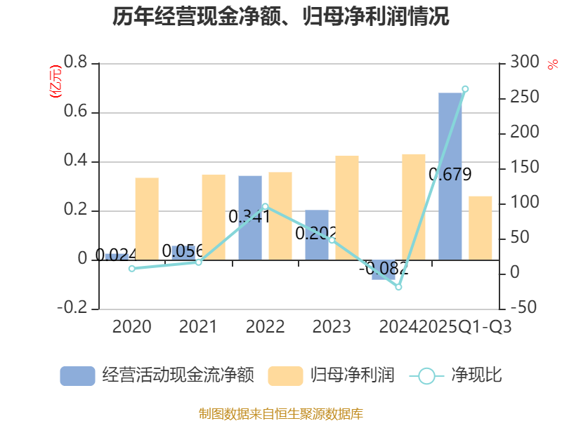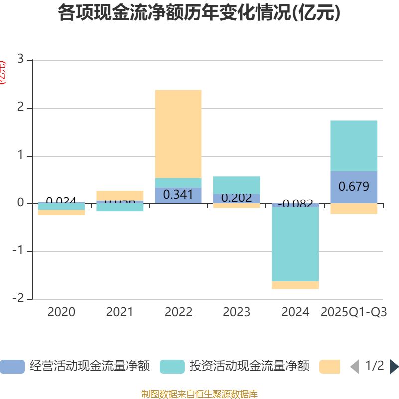 2025年前三季度,公司经营活动现金流净额为6794.17万元,同比增长79.25%;筹资活动现金流净额-2239.39万元,同比减少662.1万元;投资活动现金流净额1.05亿元,上年同期为-2.47亿元。
