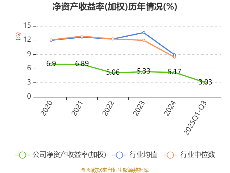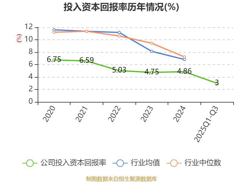 盈利能力方面, 2025年前三季度公司加权平均净资产收益率为3.03%,同比下降0.78个百分点。公司2025年前三季度投入资本回报率为3%,较上年同期下降0.59个百分点。
