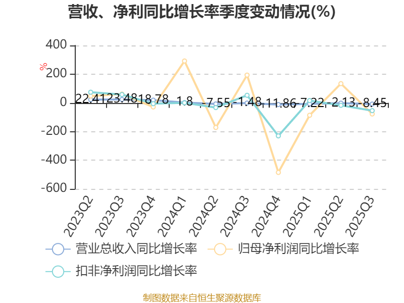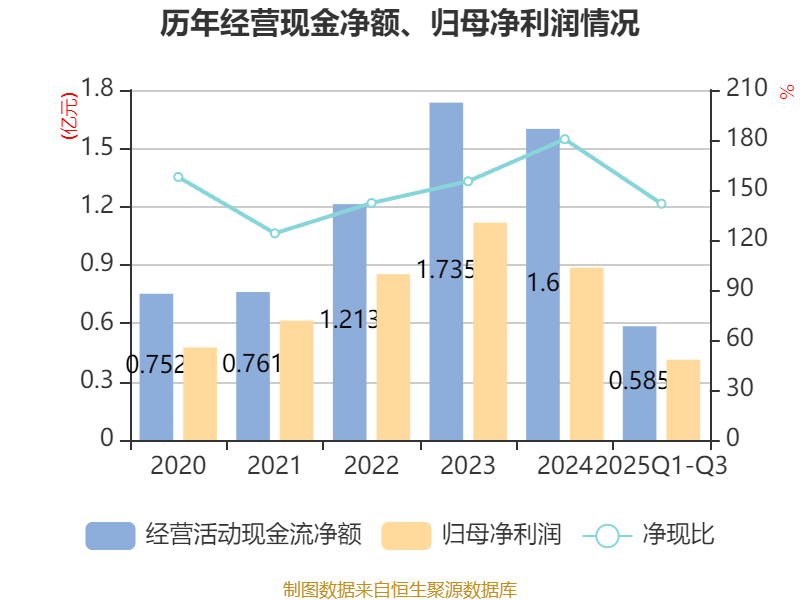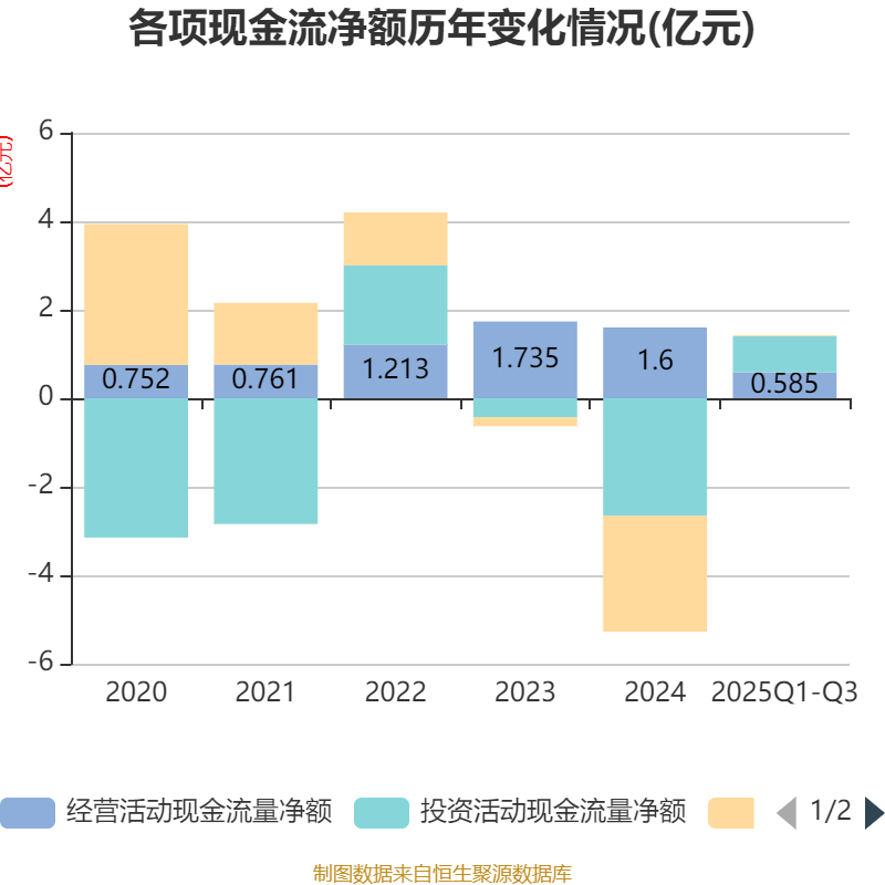 2025年前三季度,公司经营活动现金流净额为5849.74万元,同比下降27.76%;筹资活动现金流净额210.33万元,同比增加1.99亿元;投资活动现金流净额8163.24万元,上年同期为-2.74亿元。