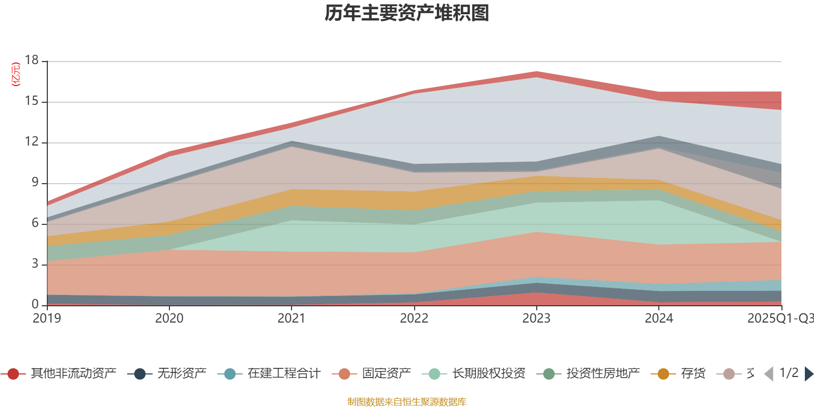 资产重大变化方面,截至2025年三季度末,公司长期股权投资较上年末减少99.35%,占公司总资产比重下降20.56个百分点;货币资金较上年末增加53.95%,占公司总资产比重上升8.85个百分点;其他应收款(含利息和股利)较上年末增加1001.36%,占公司总资产比重上升6.75个百分点;在建工程合计较上年末增加49.18%,占公司总资产比重上升1.66个百分点。