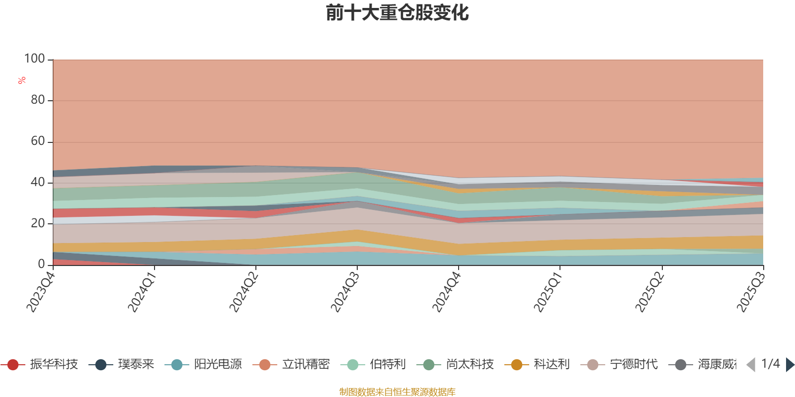 截至2025年三季度末,基金十大重仓股分别是宁德时代、科达利、阳光电源、亿纬锂能、湖南裕能、中伟股份、潍柴动力、隆基绿能、尚太科技、恩捷股份。