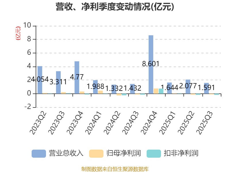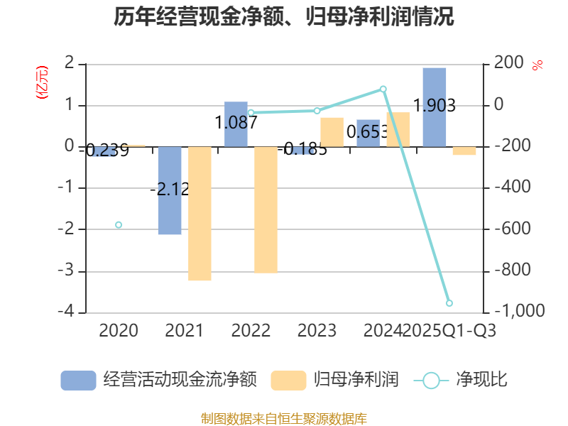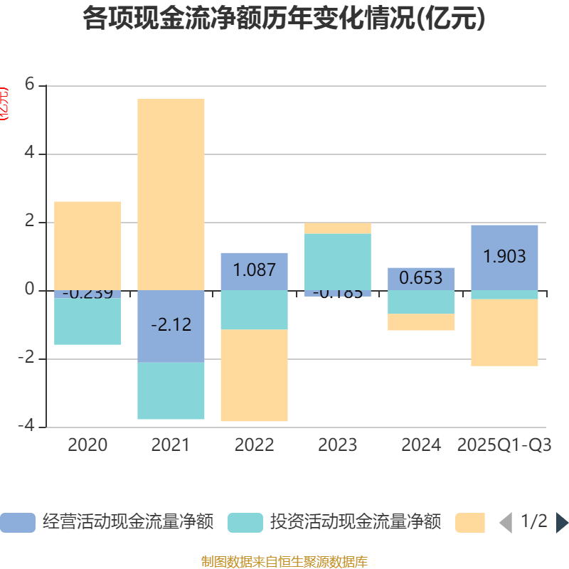 2025年前三季度,公司经营活动现金流净额为1.9亿元,同比增加2.18亿元;筹资活动现金流净额-1.96亿元,同比减少1.35亿元;投资活动现金流净额-2658.68万元,上年同期为-7113.57万元。