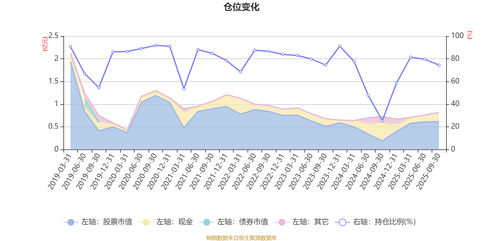 据定期报告数据统计,近三年平均股票仓位为71.48%,同类平均为72.16%。2020年三季度末基金达到91.83%的最高仓位,2024年三季度末最低,为25.48%。