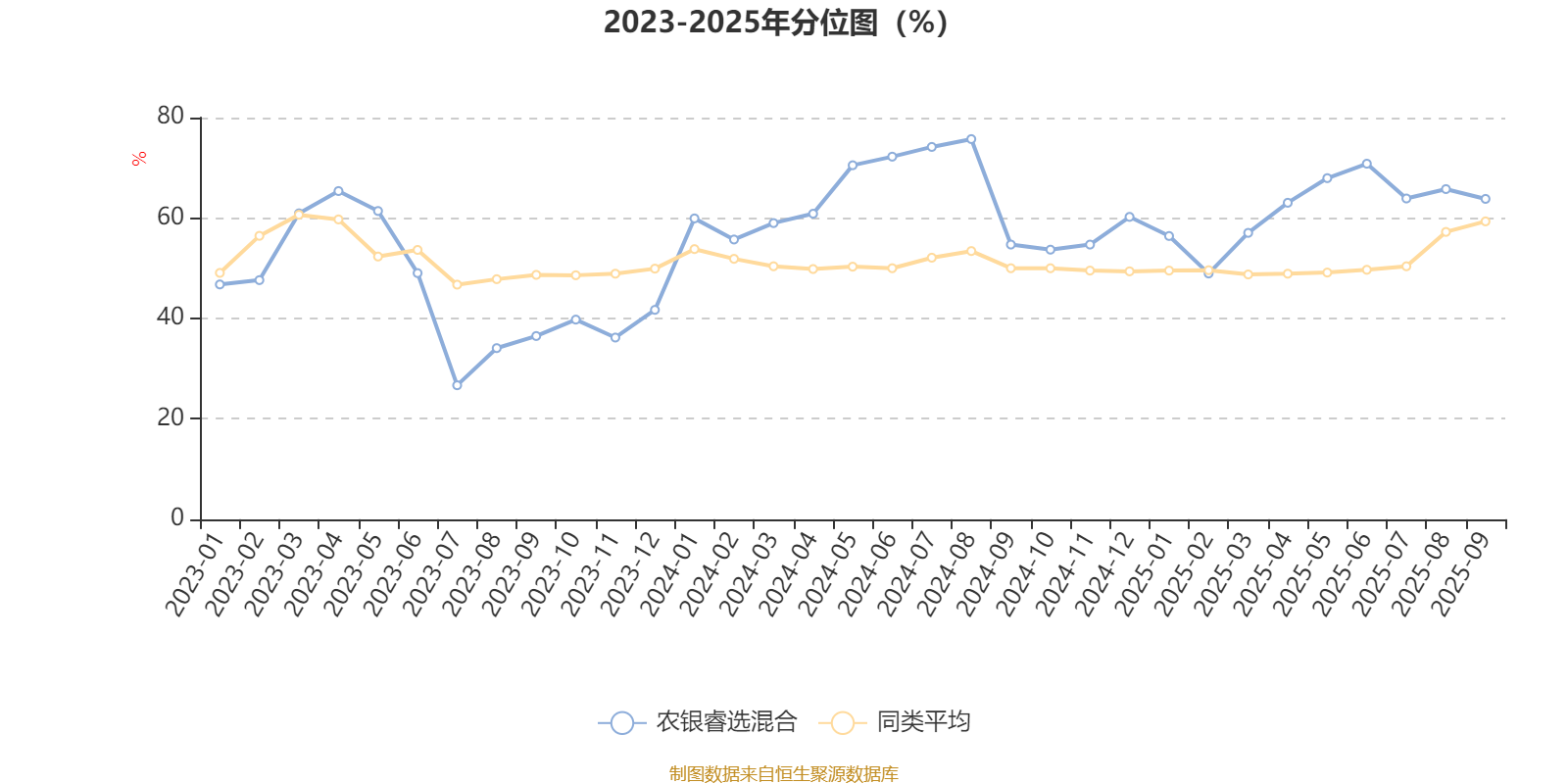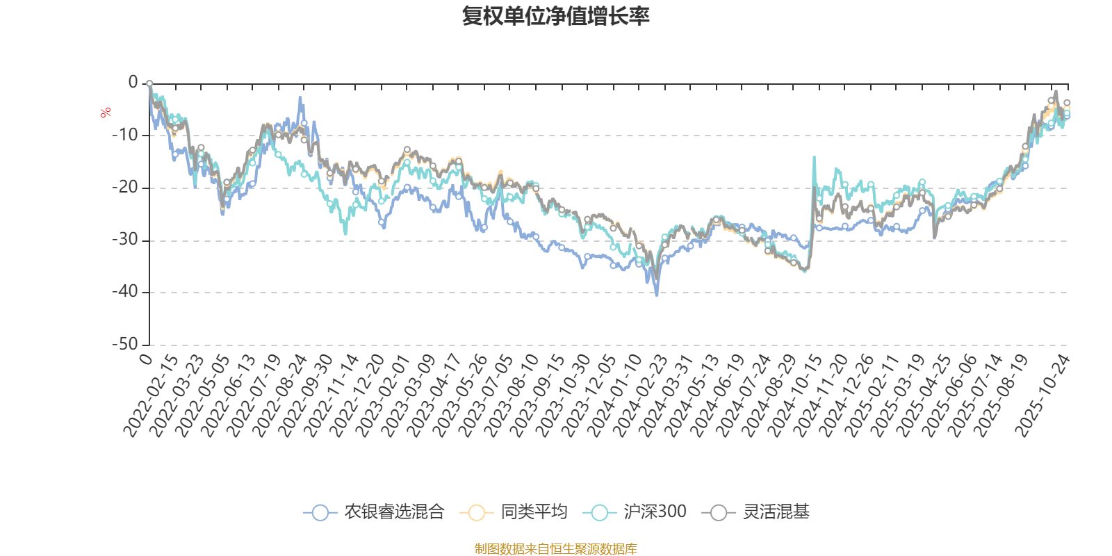 截至10月24日,农银睿选混合近三个月复权单位净值增长率为12.85%,位于同类可比基金560/1287;近半年复权单位净值增长率为24.01%,位于同类可比基金600/1287;近一年复权单位净值增长率为29.62%,位于同类可比基金443/1287;近三年复权单位净值增长率为12.73%,位于同类可比基金664/1286。