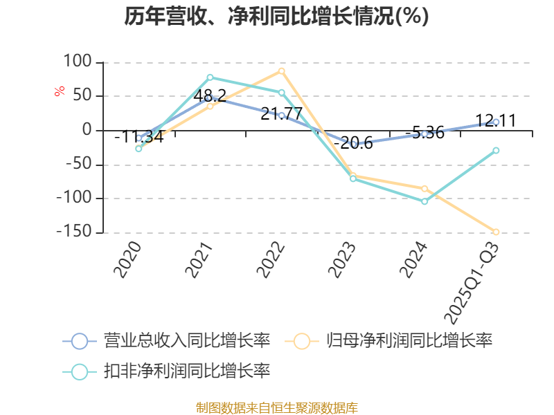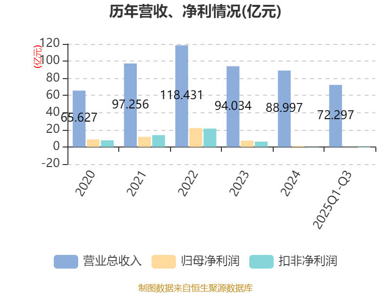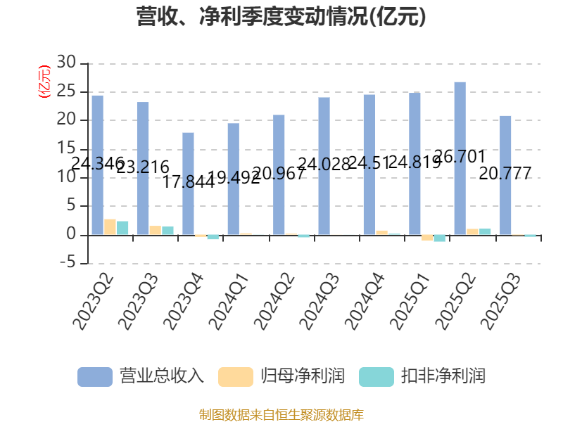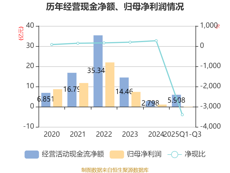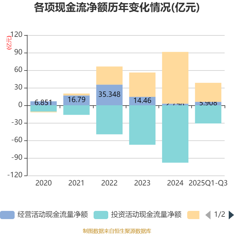 2025年前三季度,公司经营活动现金流净额为5.91亿元,同比增加7.15亿元;筹资活动现金流净额32.52亿元,同比减少17.83亿元;投资活动现金流净额-31.03亿元,上年同期为-49.94亿元。