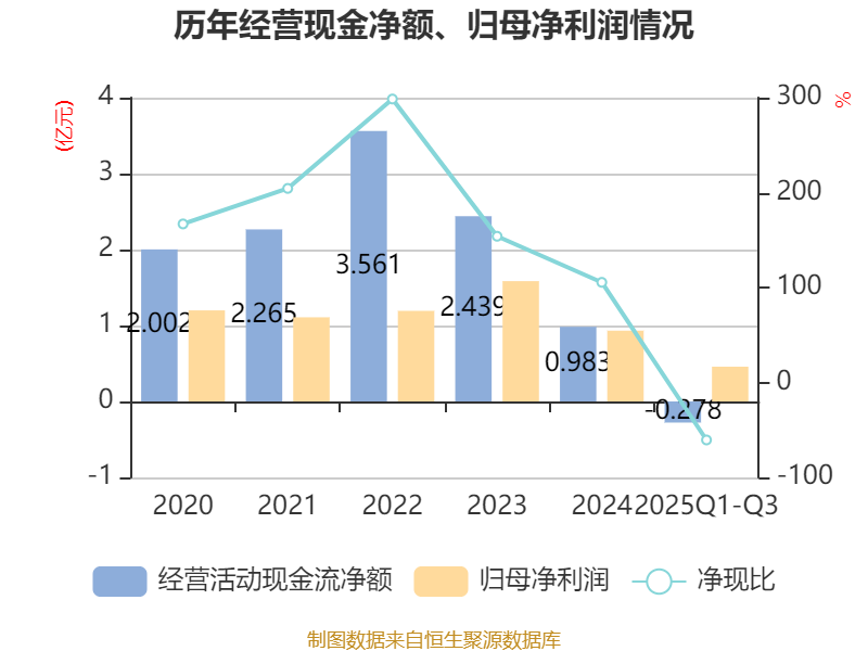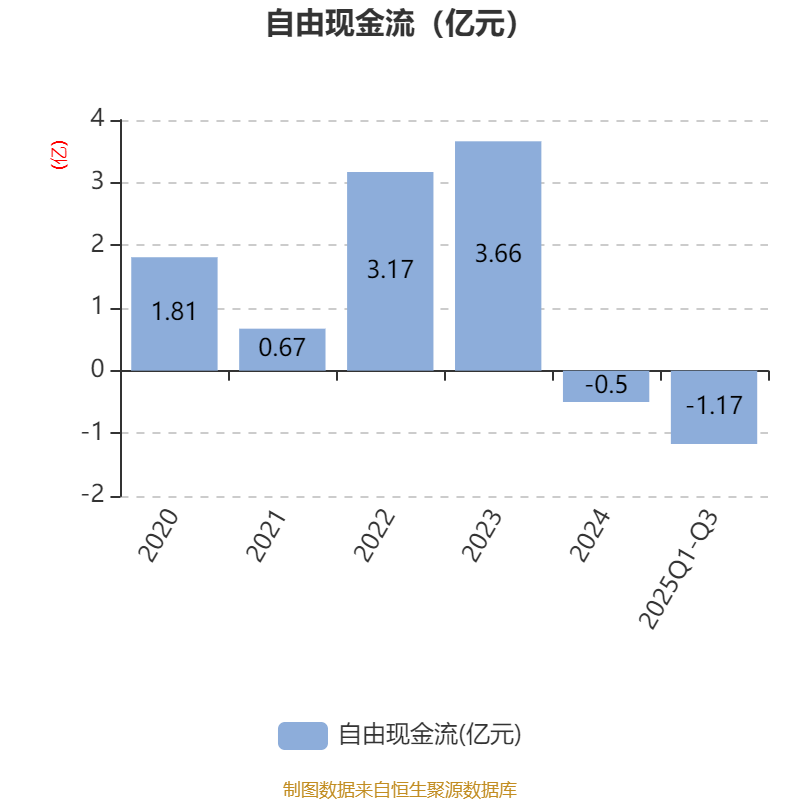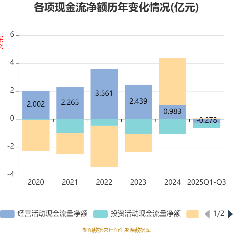 2025年前三季度,公司经营活动现金流净额为-2776.2万元,同比减少7032.66万元;筹资活动现金流净额315.64万元,同比减少1.16亿元;投资活动现金流净额-3733.26万元,上年同期为-1.1亿元。