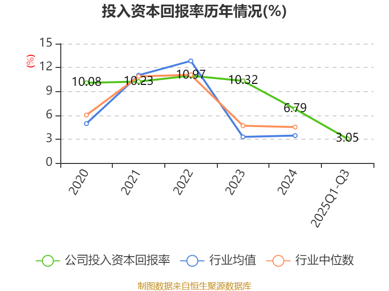 盈利能力方面, 2025年前三季度公司加权平均净资产收益率为3.29%,同比下降8.1个百分点。公司2025年前三季度投入资本回报率为3.05%,较上年同期下降5.82个百分点。