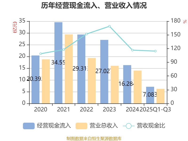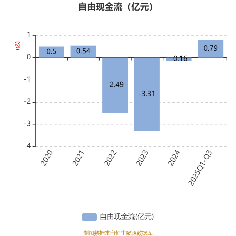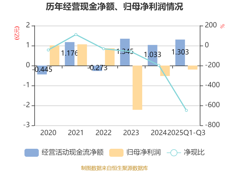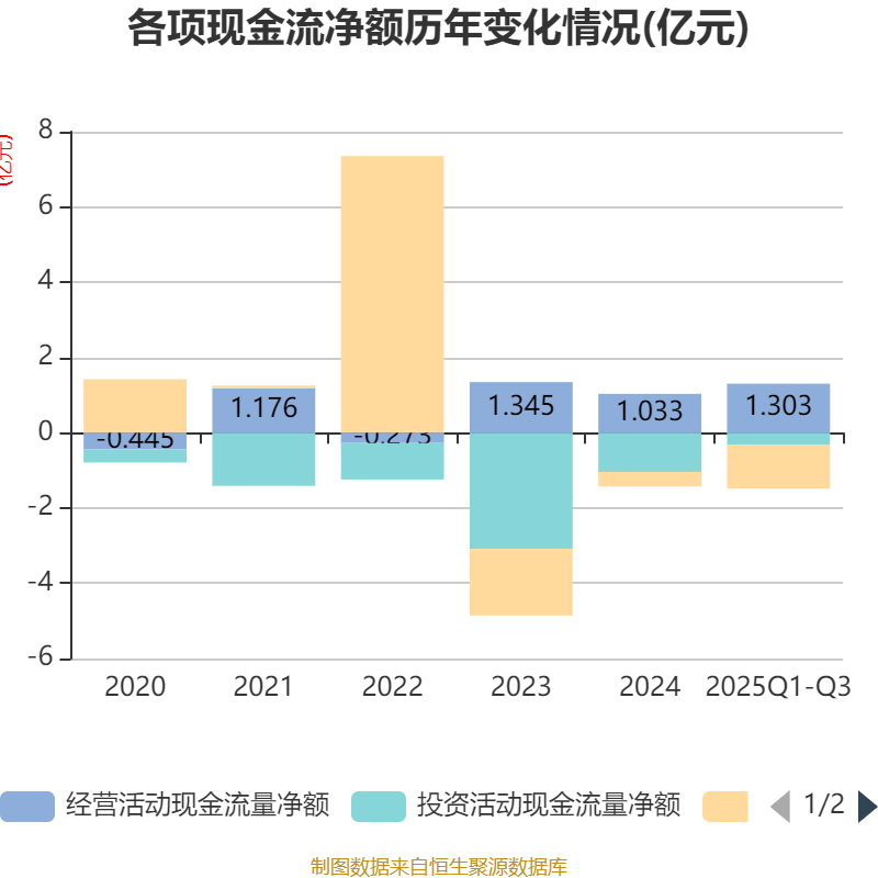 2025年前三季度,公司经营活动现金流净额为1.3亿元,同比增长7.47%;筹资活动现金流净额-1.17亿元,同比减少3695.58万元;投资活动现金流净额-3149.66万元,上年同期为-9282.42万元。