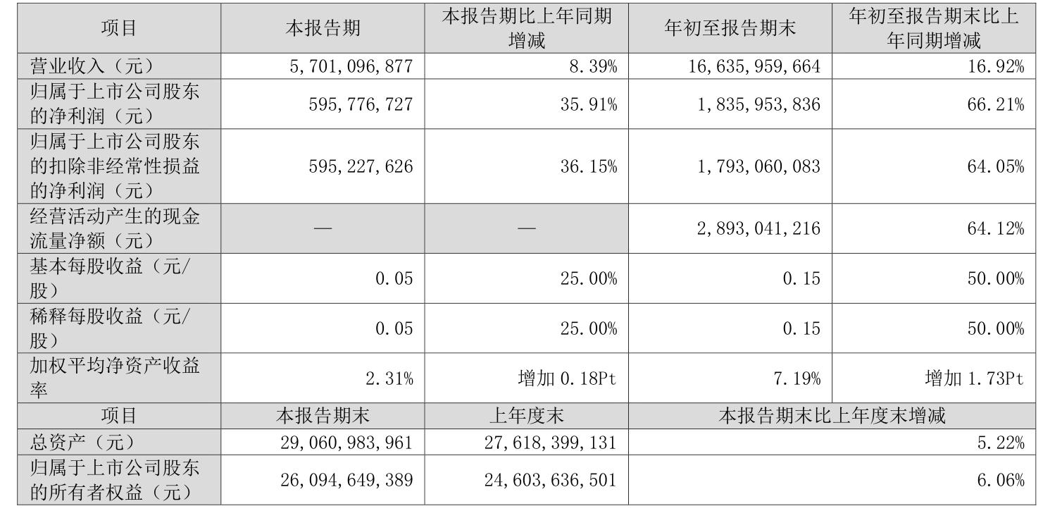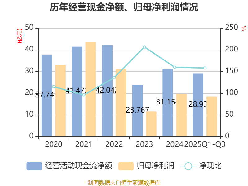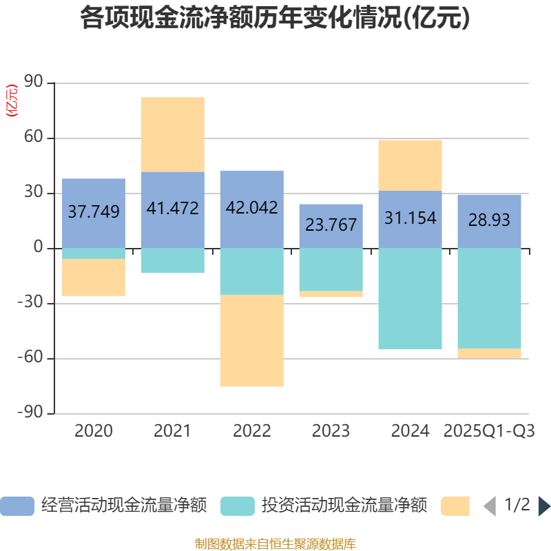 2025年前三季度,公司经营活动现金流净额为28.93亿元,同比增长64.12%;筹资活动现金流净额-5.26亿元,同比减少3.06亿元;投资活动现金流净额-54.74亿元,上年同期为-26.87亿元。
