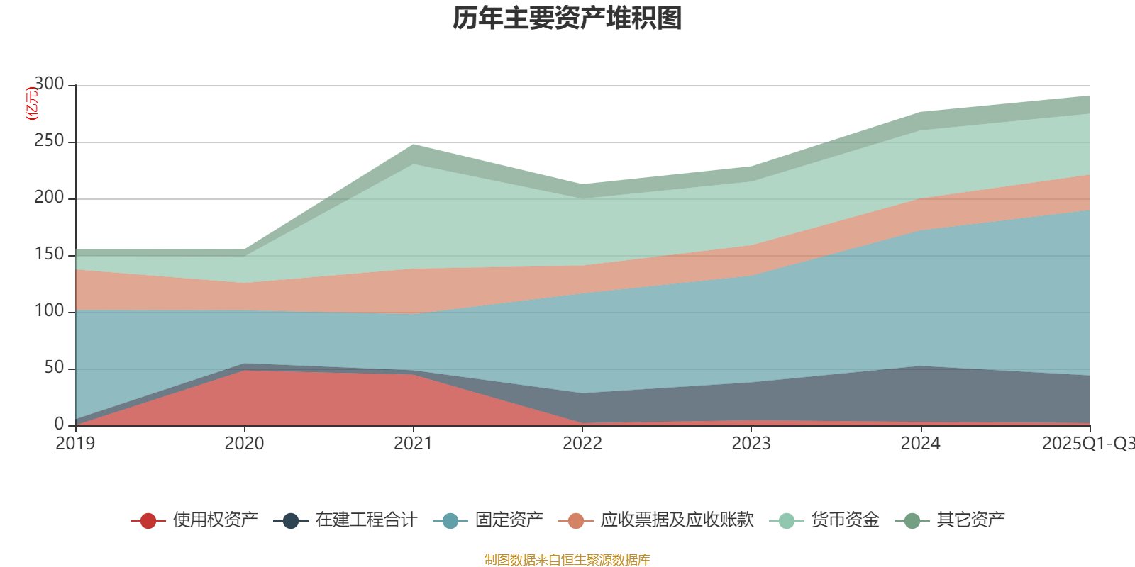 资产重大变化方面,截至2025年三季度末,公司固定资产较上年末增加21.91%,占公司总资产比重上升6.86个百分点;在建工程合计较上年末减少14.89%,占公司总资产比重下降3.42个百分点;货币资金较上年末减少10.25%,占公司总资产比重下降3.19个百分点;应收票据及应收账款较上年末增加10.9%,占公司总资产比重上升0.55个百分点。