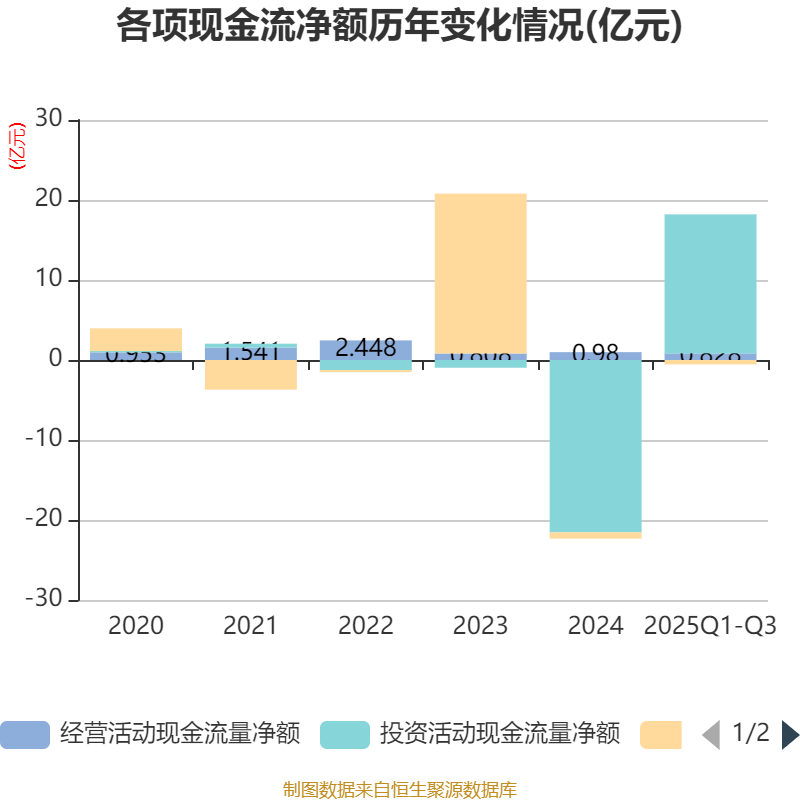 2025年前三季度,公司经营活动现金流净额为8276.58万元,同比增长88.03%;筹资活动现金流净额-5529.73万元,同比增加323.69万元;投资活动现金流净额17.37亿元,上年同期为-1.14亿元。