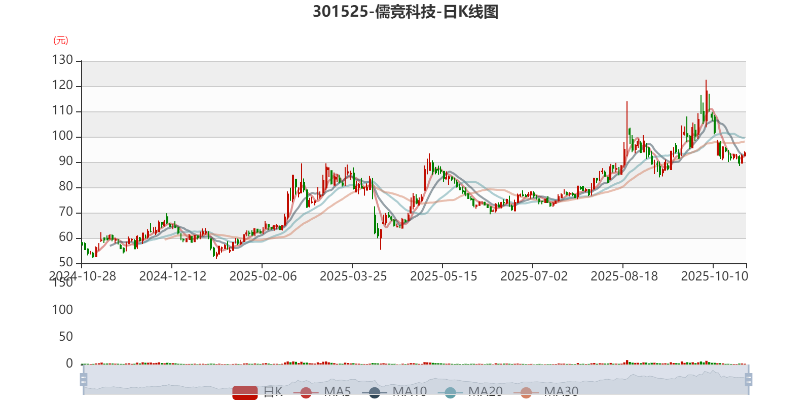 以10月27日收盘价计算,儒竞科技目前市盈率(TTM)约为57.48倍,市净率(LF)约2.71倍,市销率(TTM)约6.88倍。
