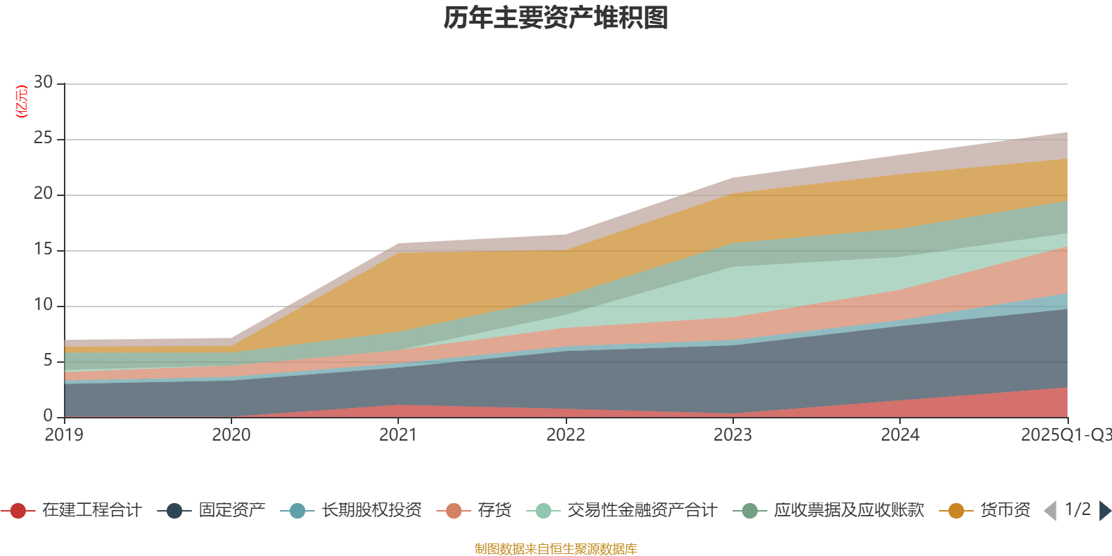 资产重大变化方面,截至2025年三季度末,公司交易性金融资产合计较上年末减少60.64%,占公司总资产比重下降8.01个百分点;货币资金较上年末减少22.46%,占公司总资产比重下降5.97个百分点;存货较上年末增加55.11%,占公司总资产比重上升4.94个百分点;在建工程合计较上年末增加77.5%,占公司总资产比重上升4.03个百分点。