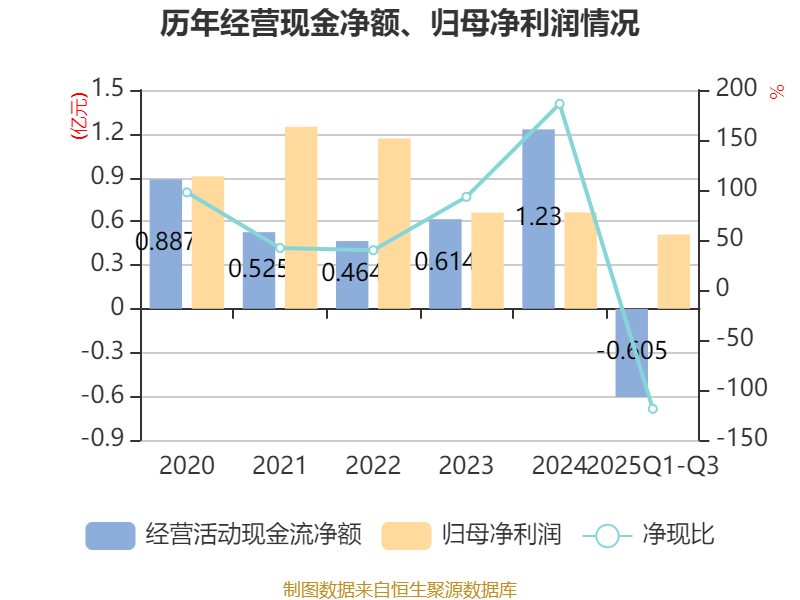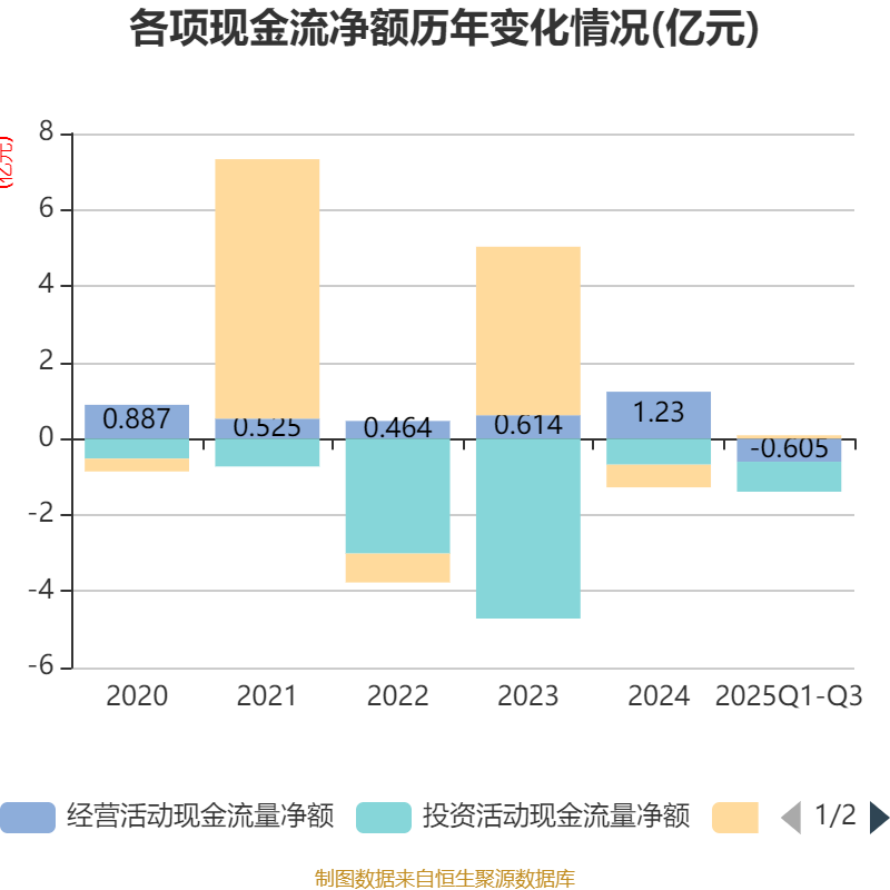 2025年前三季度,公司经营活动现金流净额为-6047.23万元,同比减少9166.81万元;筹资活动现金流净额875.84万元,同比增加8247.62万元;投资活动现金流净额-7860.74万元,上年同期为2.09亿元。