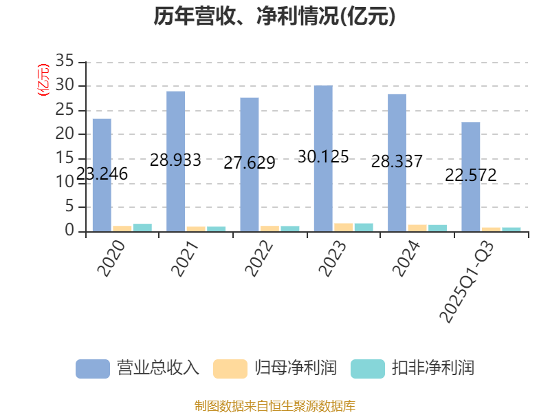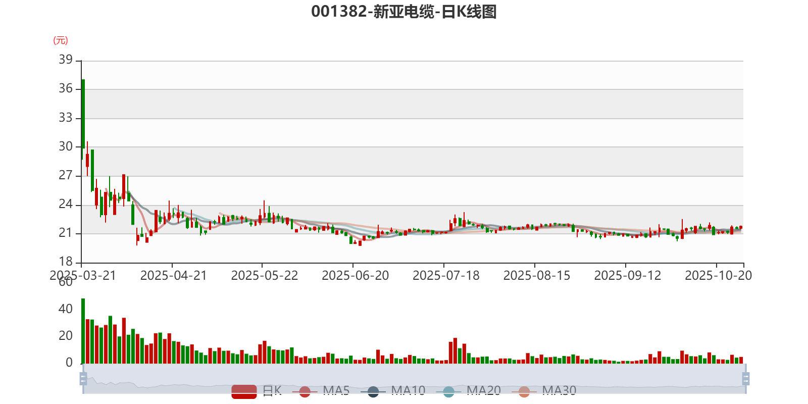 中证智能财讯新亚电缆(001382)10月28日披露2025年第三季度报告。前三季度公司实现营业总收入22.57亿元,同比增长10.05%;归母净利润7718.23万元,同比下降14.56%;扣非净利润7756.55万元;经营活动产生的现金流量净额为-3.72亿元,上年同期为-1.34亿元;报告期内,新亚电缆基本每股收益为0.2元,加权平均净资产收益率为5.23%。