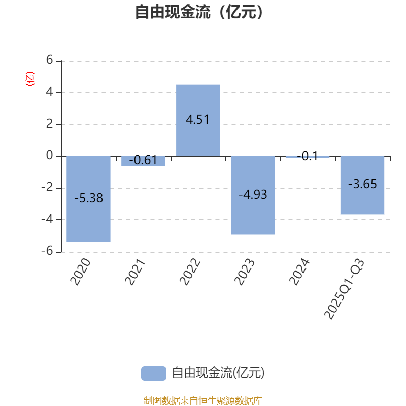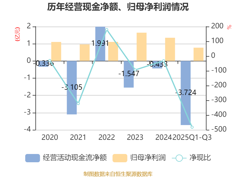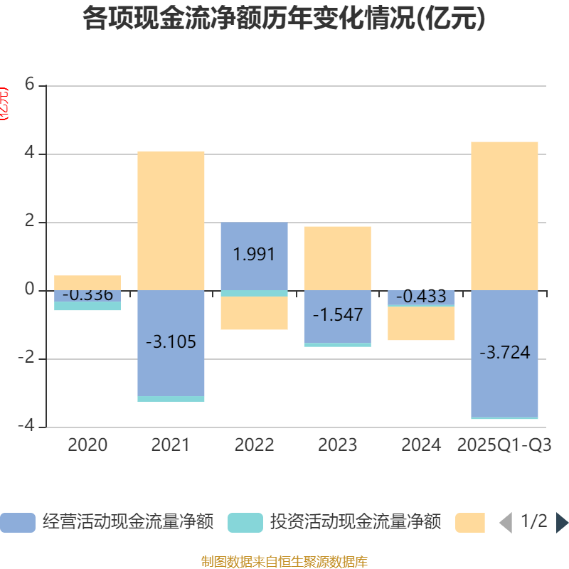 2025年前三季度,公司经营活动现金流净额为-3.72亿元,同比减少2.39亿元;筹资活动现金流净额4.34亿元,同比增加3.71亿元;投资活动现金流净额-501万元,上年同期为-397.18万元。