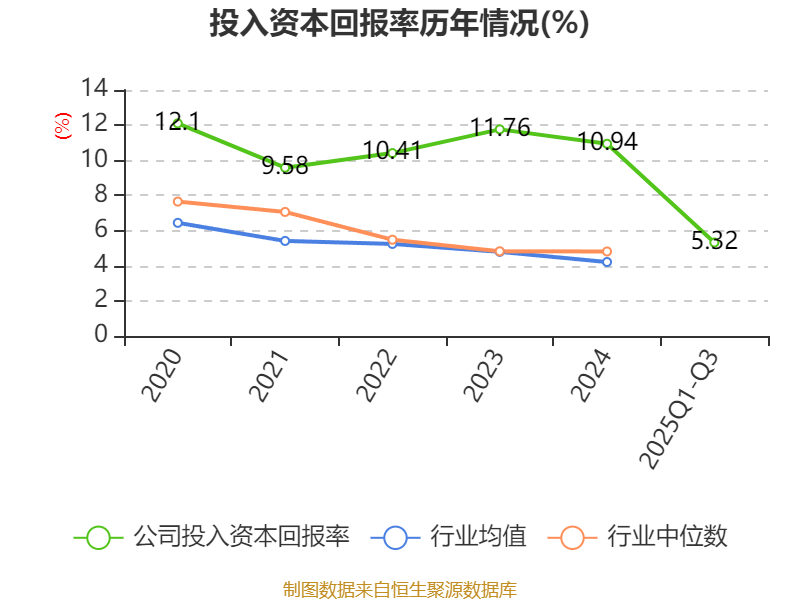 盈利能力方面, 2025年前三季度公司加权平均净资产收益率为5.23%。公司2025年前三季度投入资本回报率为5.32%,较上年同期下降2.75个百分点。