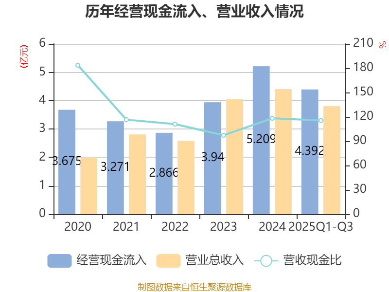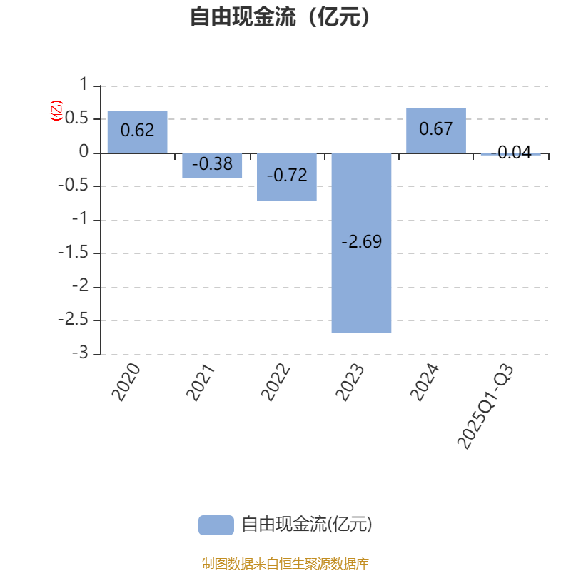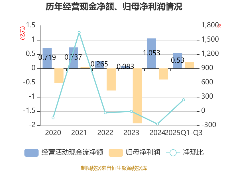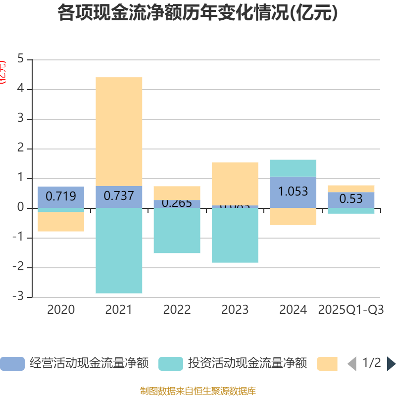 2025年前三季度,公司经营活动现金流净额为5295.68万元,同比下降46.38%;筹资活动现金流净额2282.74万元,同比增加9768.4万元;投资活动现金流净额-1956.19万元,上年同期为4040.05万元。