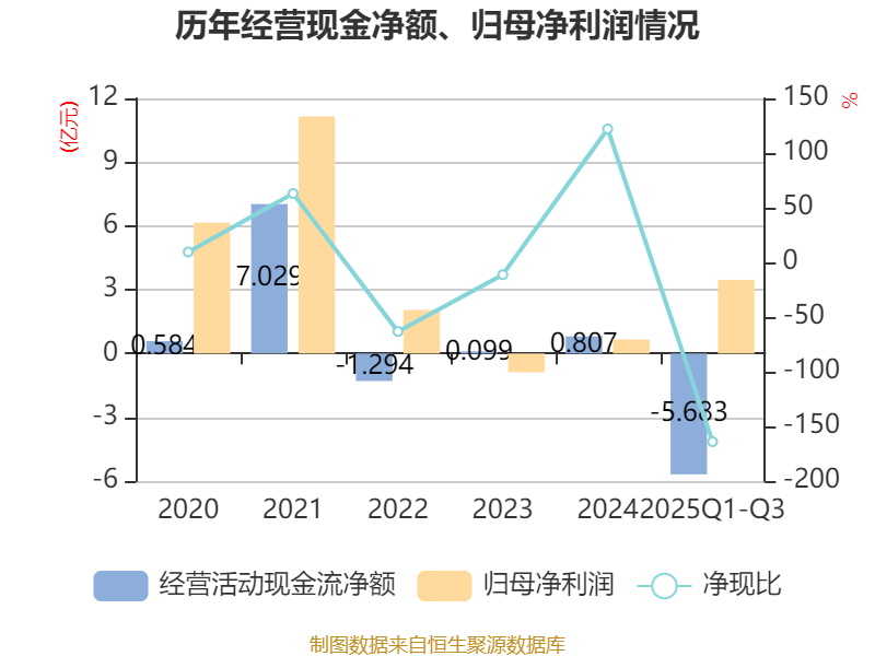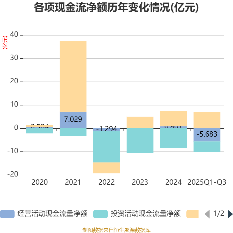 2025年前三季度,公司经营活动现金流净额为-5.68亿元,同比减少5.42亿元;筹资活动现金流净额6.99亿元,同比增加2.35亿元;投资活动现金流净额-4.49亿元,上年同期为-5.52亿元。
