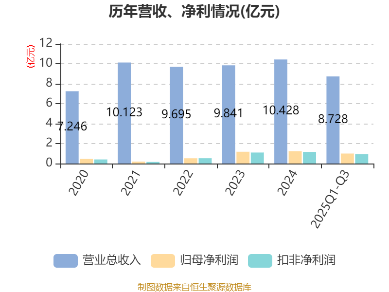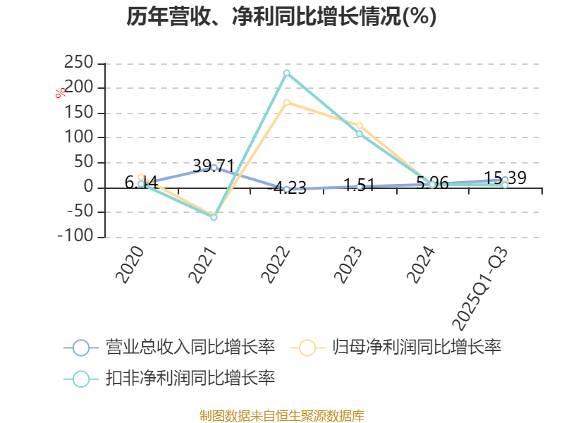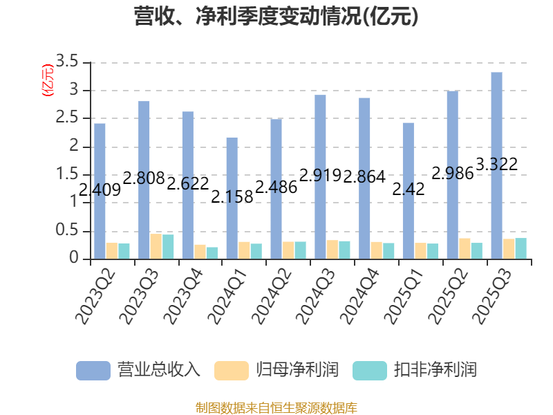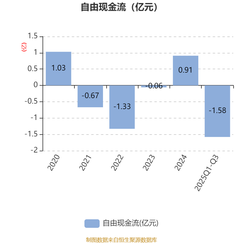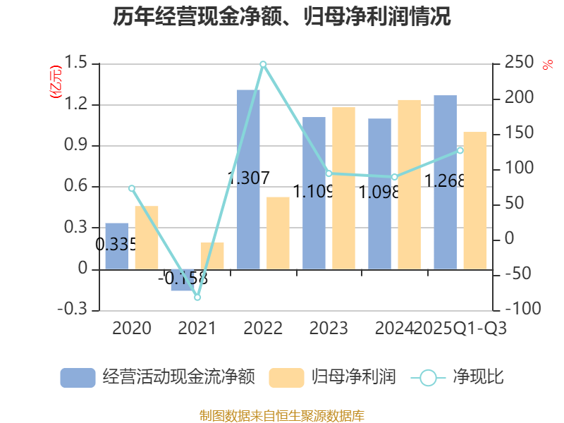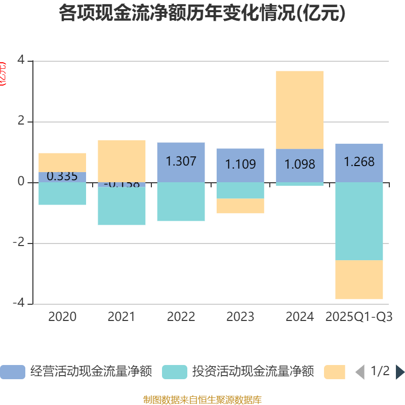 2025年前三季度,公司经营活动现金流净额为1.27亿元,同比增长52.18%;筹资活动现金流净额-1.28亿元,同比减少7162.09万元;投资活动现金流净额-2.57亿元,上年同期为-1082.7万元。