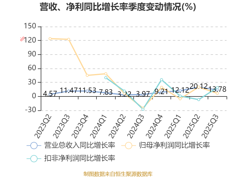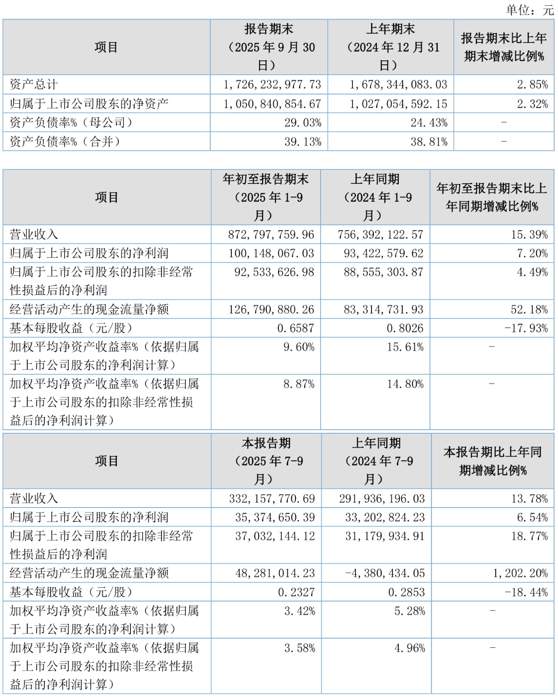 负债重大变化方面,截至2025年三季度末,公司应付票据及应付账款较上年末增加18.39%,占公司总资产比重上升3.48个百分点;短期借款较上年末减少22.59%,占公司总资产比重下降3.12个百分点;其他流动负债较上年末增加12.84%,占公司总资产比重上升0.08个百分点;长期递延收益较上年末减少4.6%,占公司总资产比重下降0.07个百分点。