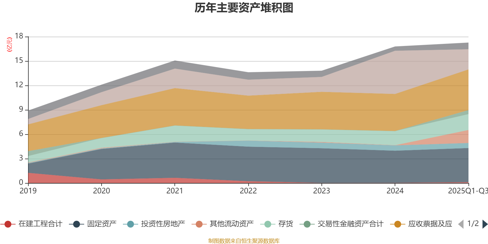 资产重大变化方面,截至2025年三季度末,公司货币资金较上年末减少53.3%,占公司总资产比重下降17.28个百分点;其他流动资产较上年末增加6710.53%,占公司总资产比重上升9.1个百分点;交易性金融资产合计占公司总资产的2.9%,上年末为0;应收票据及应收账款较上年末增加9.63%,占公司总资产比重上升1.79个百分点。
