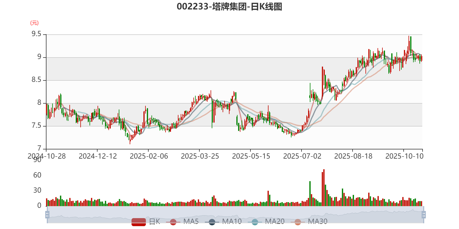 中证智能财讯塔牌集团(002233)10月28日披露2025年第三季度报告。前三季度公司实现营业总收入29.16亿元,同比下降0.49%;归母净利润5.88亿元,同比增长54.23%;扣非净利润3.1亿元,同比增长26.82%;经营活动产生的现金流量净额为2.6亿元,同比增长27.72%;报告期内,塔牌集团基本每股收益为0.5元,加权平均净资产收益率为4.91%。