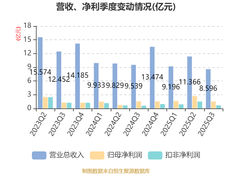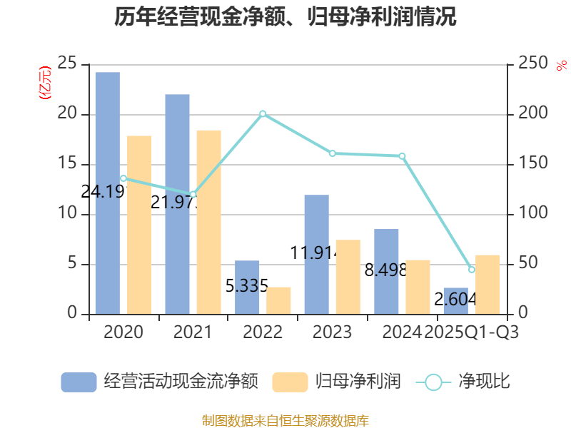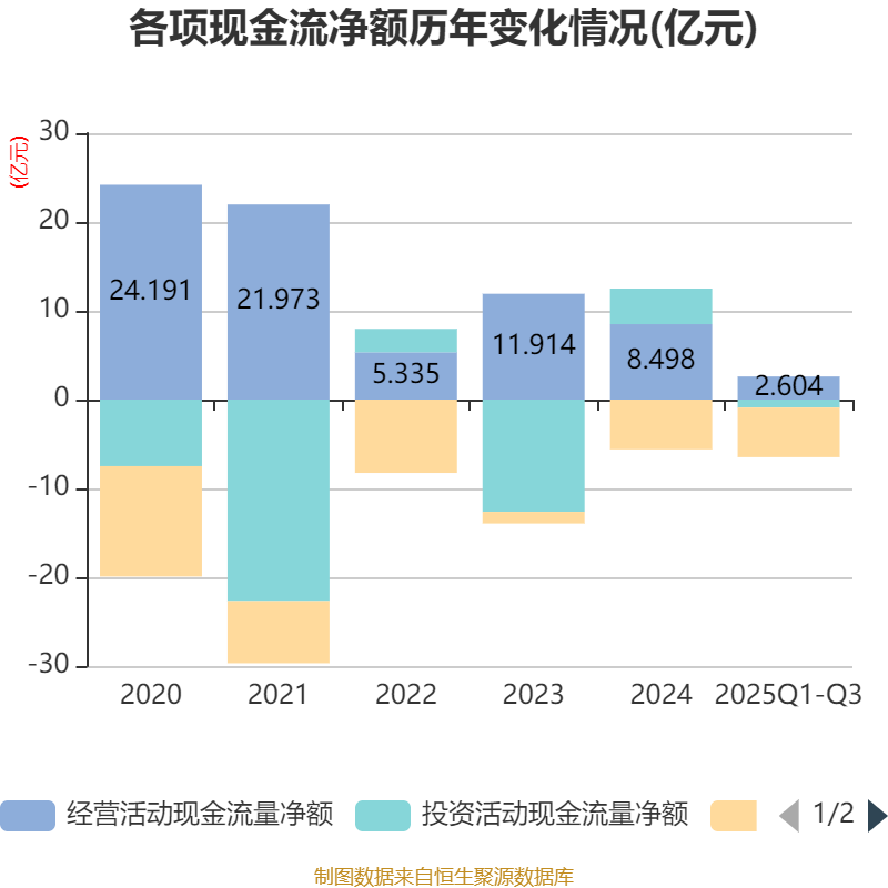 2025年前三季度,公司经营活动现金流净额为2.6亿元,同比增长27.72%;筹资活动现金流净额-5.59亿元,同比减少29.97万元;投资活动现金流净额-8930.45万元,上年同期为9.51亿元。